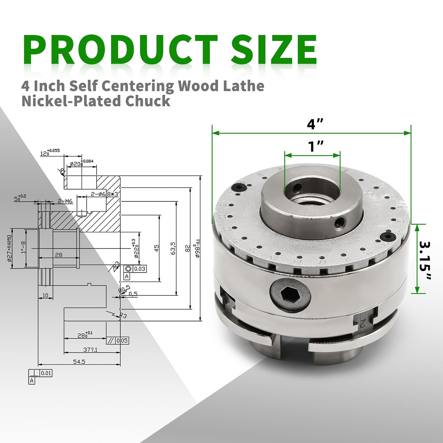 - Lathe adaptation: 4-inch diameter self-centering woodworking lathes are compatible with nickel-plated chucks with 1 "x 8 TPI thread lathes with a screw depth of 28mm (1.1IN) and chuck height of 54.5mm (2.16IN).