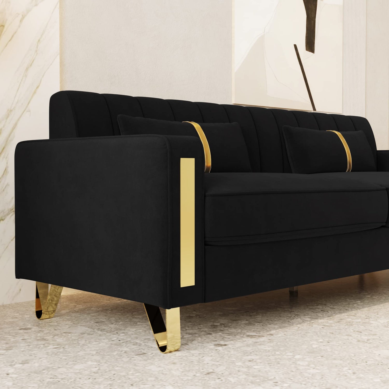 yunqishi 85.63" Modern Black Velvet Sofa with Gold Metal Legs Large Upholstered Comfy 3 Seater Couches for Living Room Bedroom Office (Black)