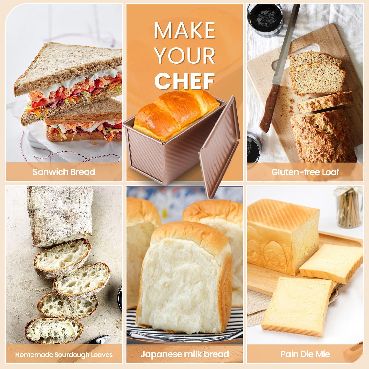 - MAKE YOUR CHEF: Our commercial-grade bread baking pan caters to various baking needs. Whether for traditional sandwich bread, gluten-free loaves, pain de mie, whole grain bread, or french toast, this 1 lb pullman loaf pan delivers outstanding results. Use the lid for beautifully shaped loaves, or remove it to create a versatile tool for making toast. Unleash your culinary creativity with endless baking possibilities.