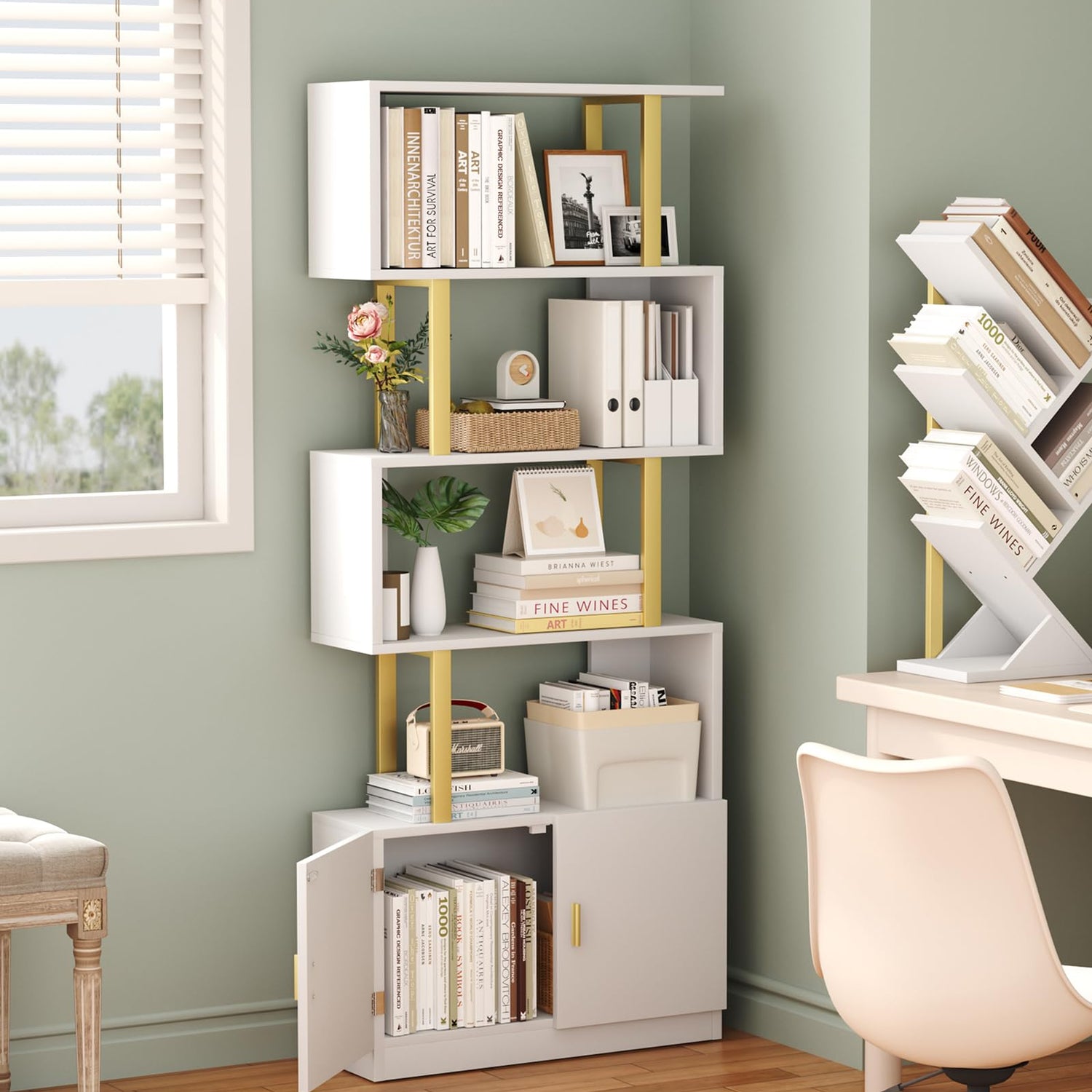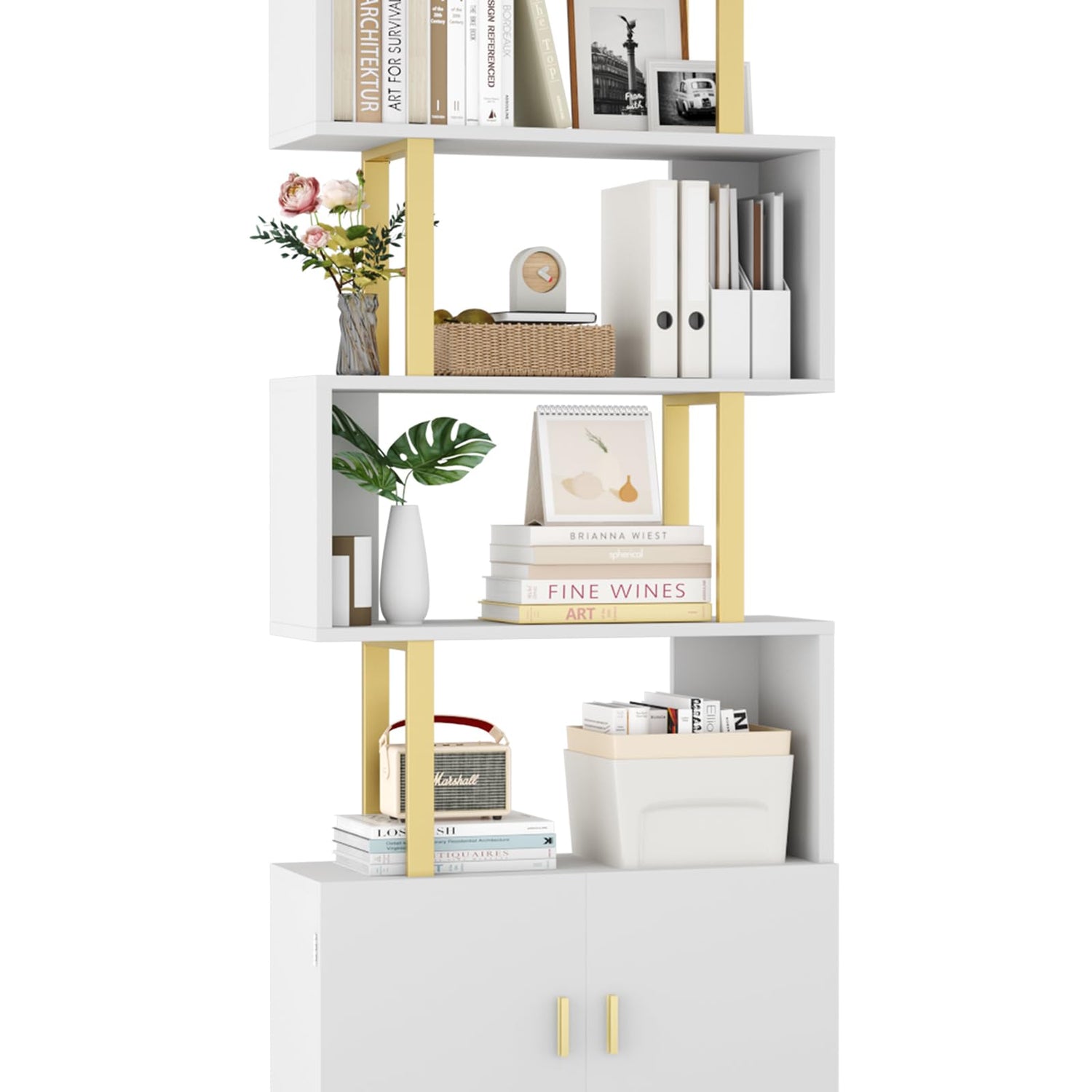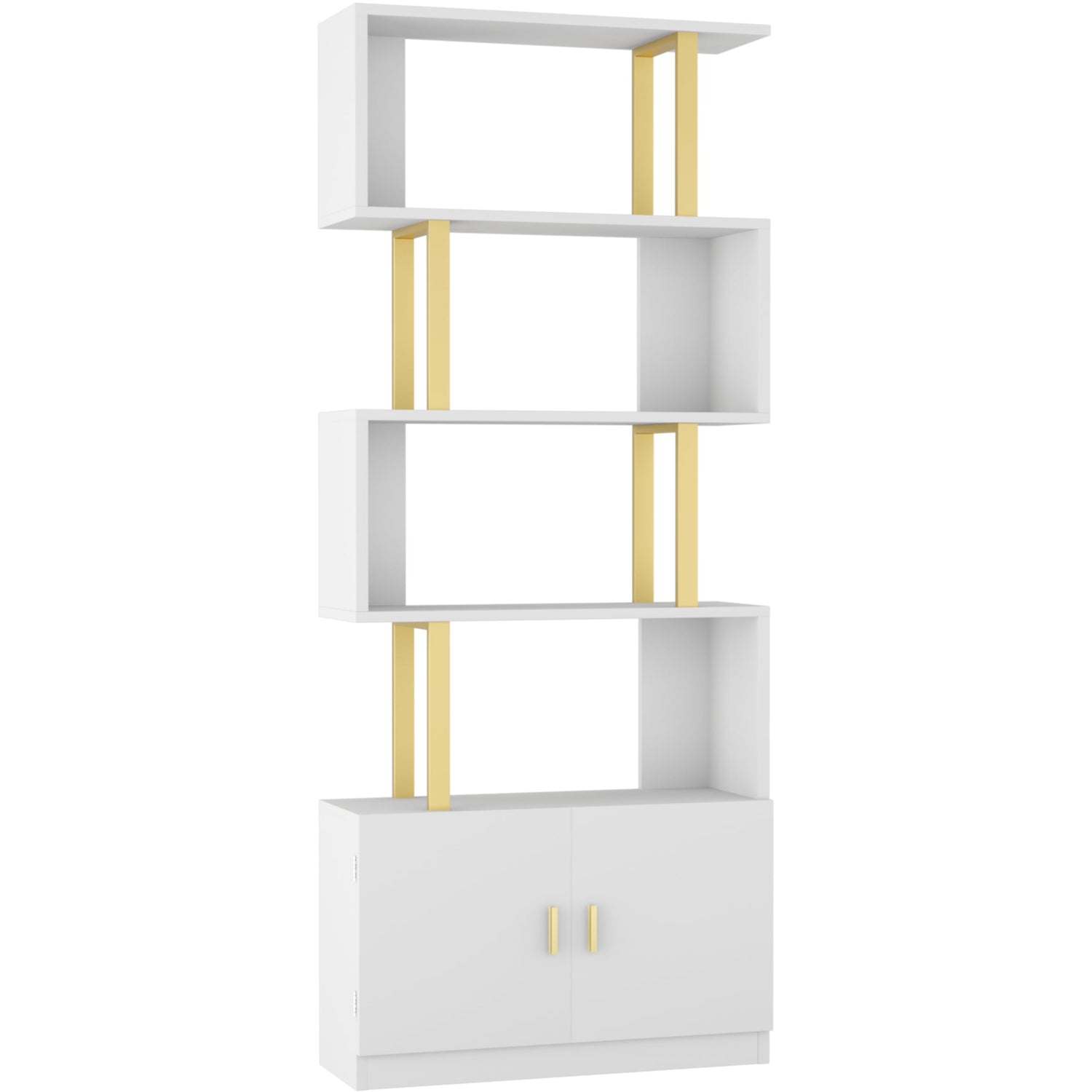 Yusong Geometric Bookcase with Cabinet, S Shaped Bookshelf 5-Tier Book Shelves for Bedroom, Modern Wood Decorative Display Shelf Tall Book Case for Home Office, Gold and White