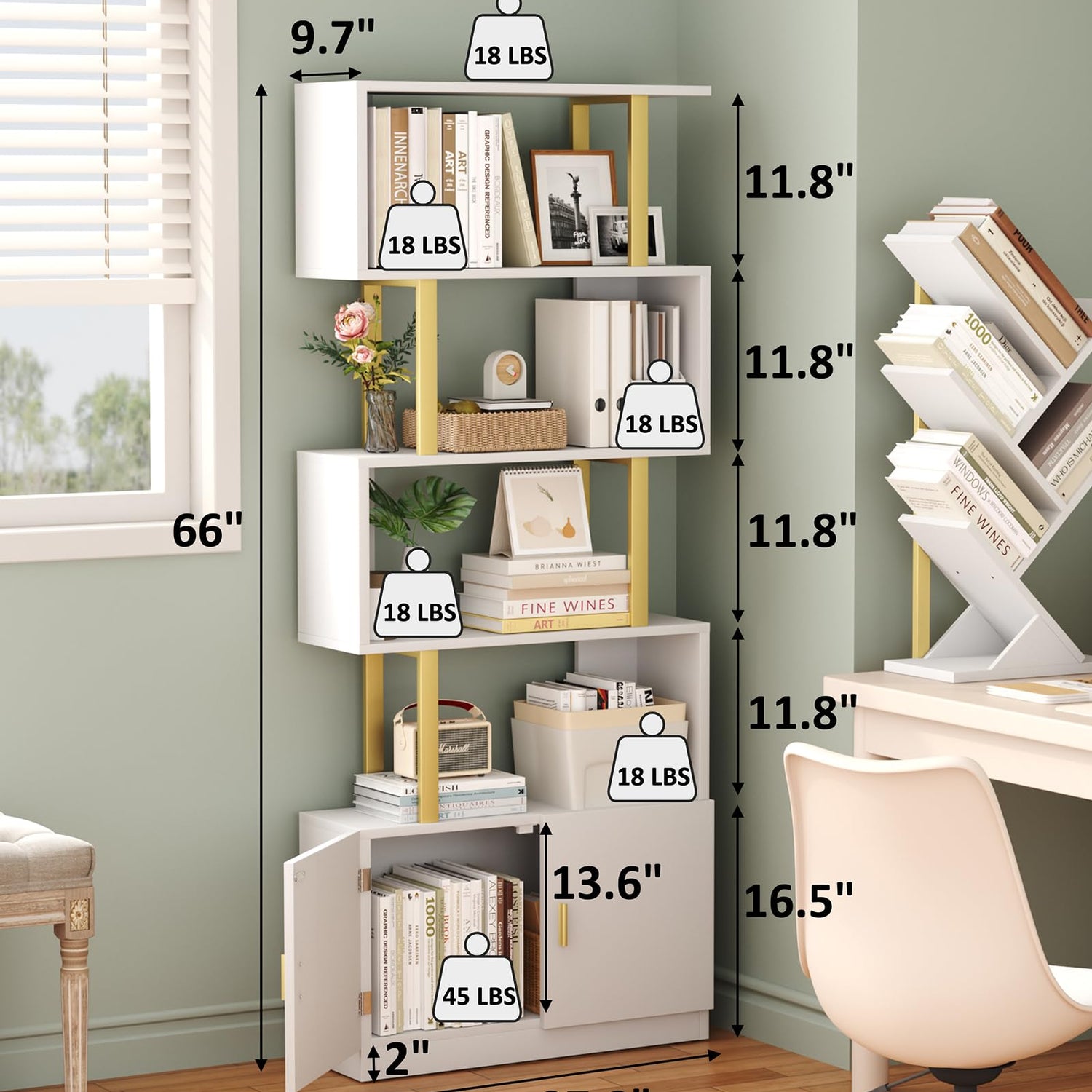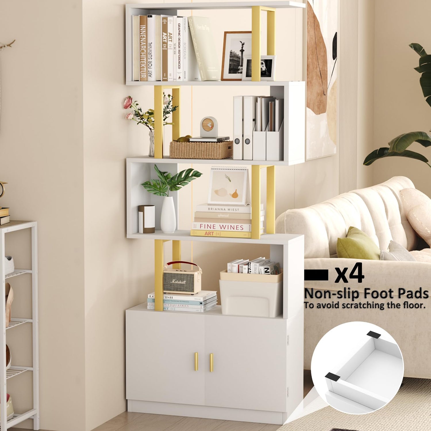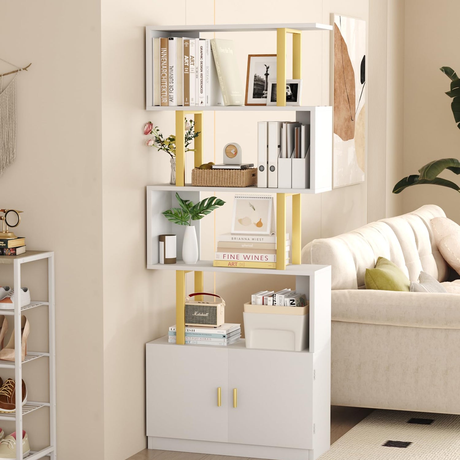 Yusong Geometric Bookcase with Cabinet, S Shaped Bookshelf 5-Tier Book Shelves for Bedroom, Modern Wood Decorative Display Shelf Tall Book Case for Home Office, Gold and White