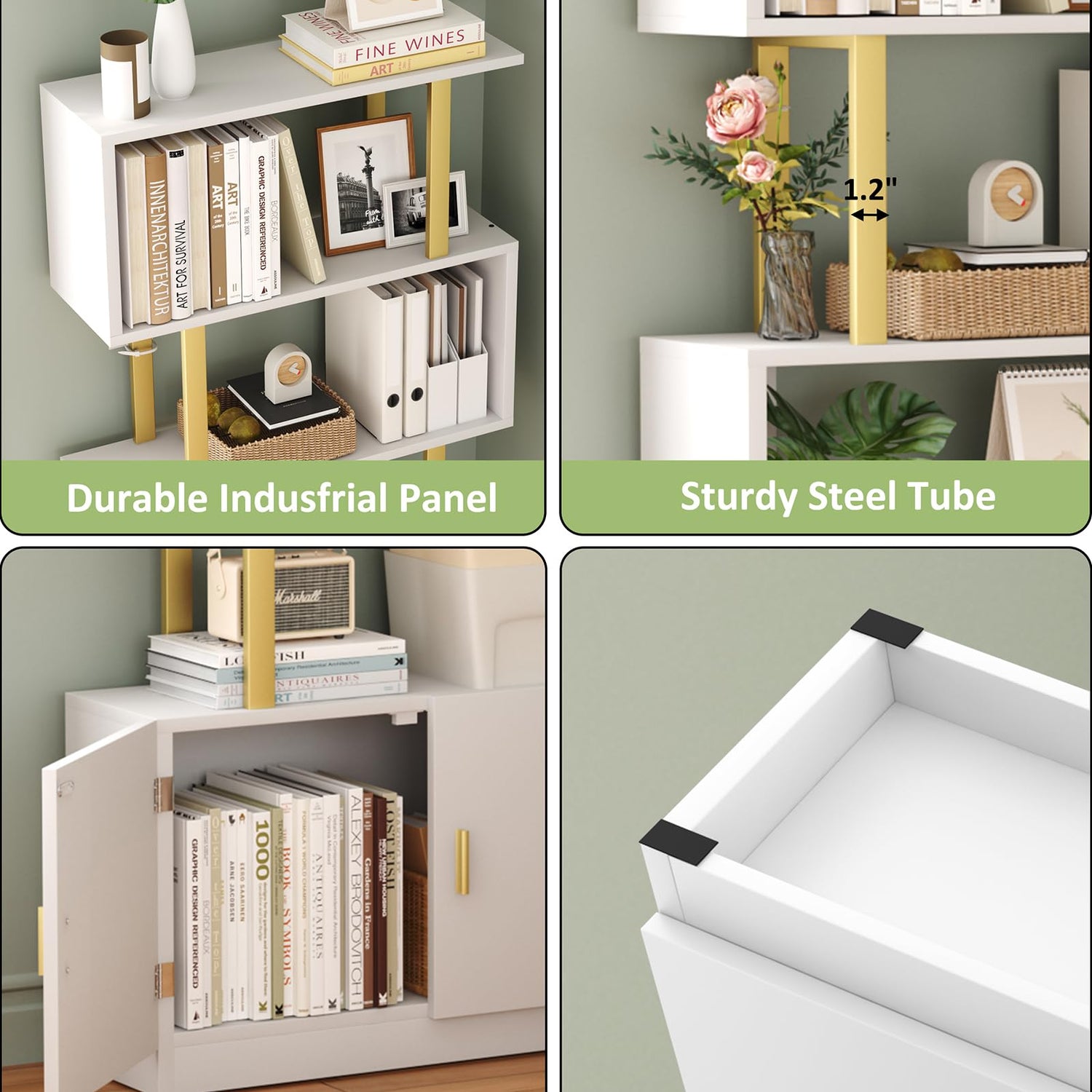 - 【Multifunctional Freestand Shelf】Maximum usage: Used as a book case to neatly arrange books, documents, and magazines, a display rack to showcase photos and prized collections, or an office rack for efficient organization.Additionally, small plants can be gracefully placed on its extending open shelf, adding a touch of greenery