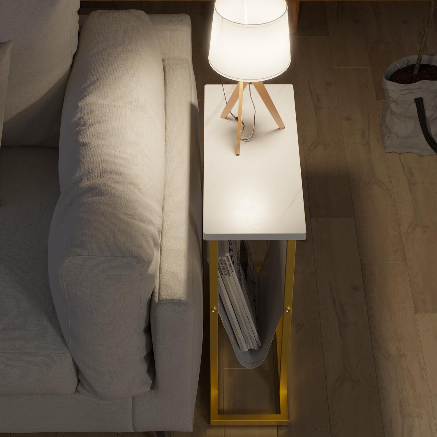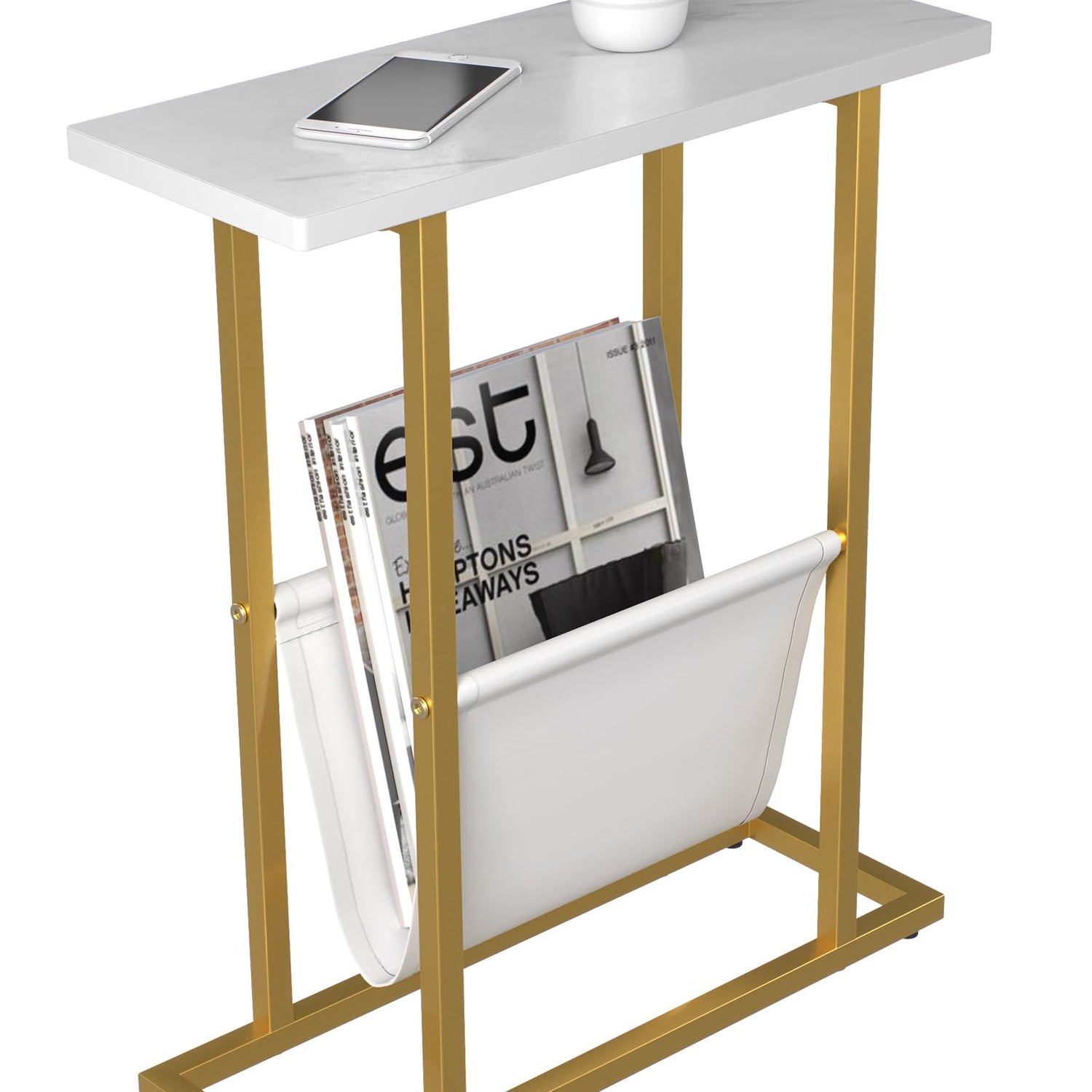 Yusong Small Narrow Side Table for Small Spaces, 17.7" W Slim End Table Magazine Table Nighstand with Storage Holder, Accent Skinny Snack Couch Bedside Table, Gold White, Complete Iron Pipes