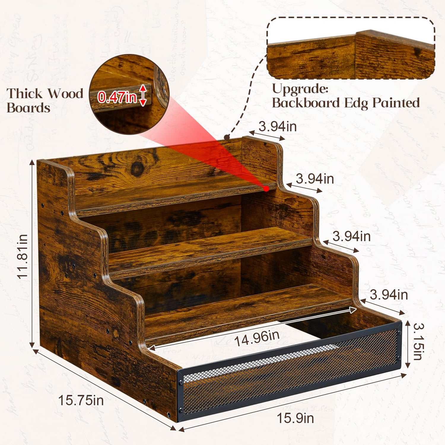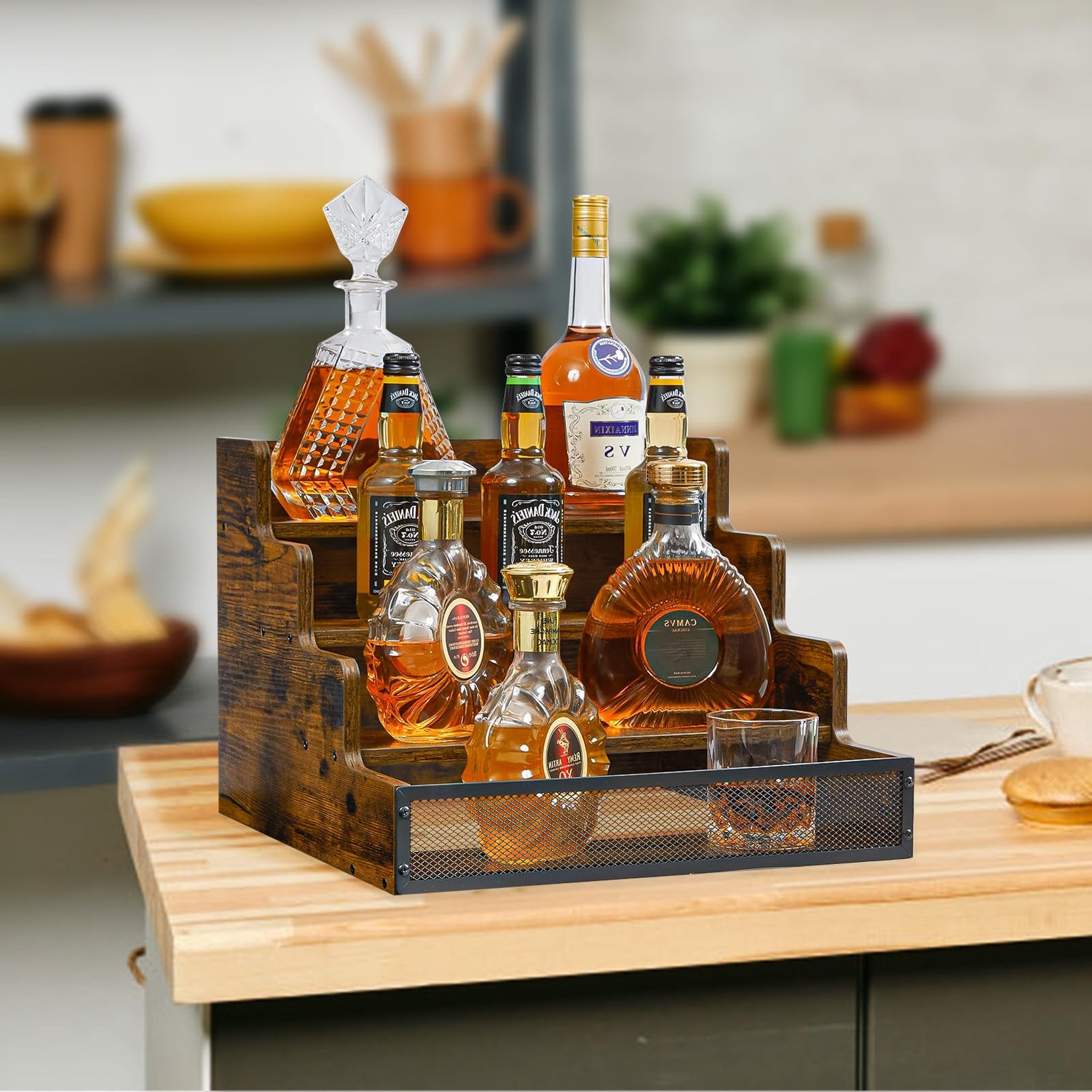 Yuzehuaza 4 Step Countertop Liquor Bottle Display Shelf, Wood Bar Shelves 16 Bottles with Fences, Freestanding Storage Shelves for Liquor Whiskey Wine Coffee Syrup Display, Retro Wine Rack Home