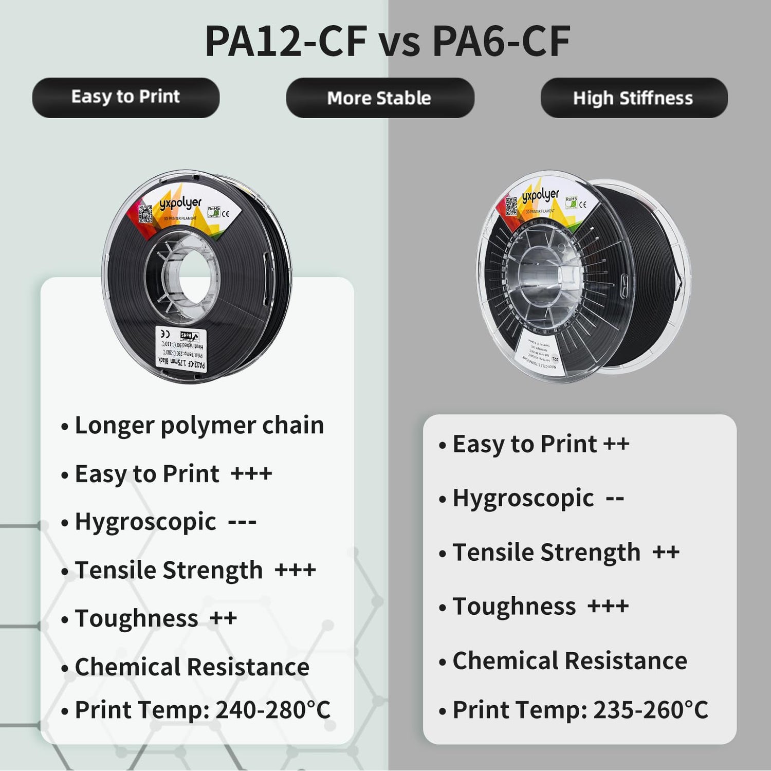 - 【High Dimensional Stability】YXPOLYER PA12-CF has added 15% carbon fiber, this carefully formulated blend ensures ease of stable prints, extremely high successful rate, outstanding surface finish and good layer adhesion with no warping and less shrinkage