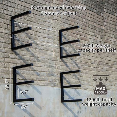 - 【Weight Capacity of 1200 LBS】YYR lumber storage rack wall mounted is made of powder-coated 1⅙” (3 cm) steel tube construction。After many tests, each shelf can hold up to 200 lbs, which means a total weight capacity of 1200 lbs.