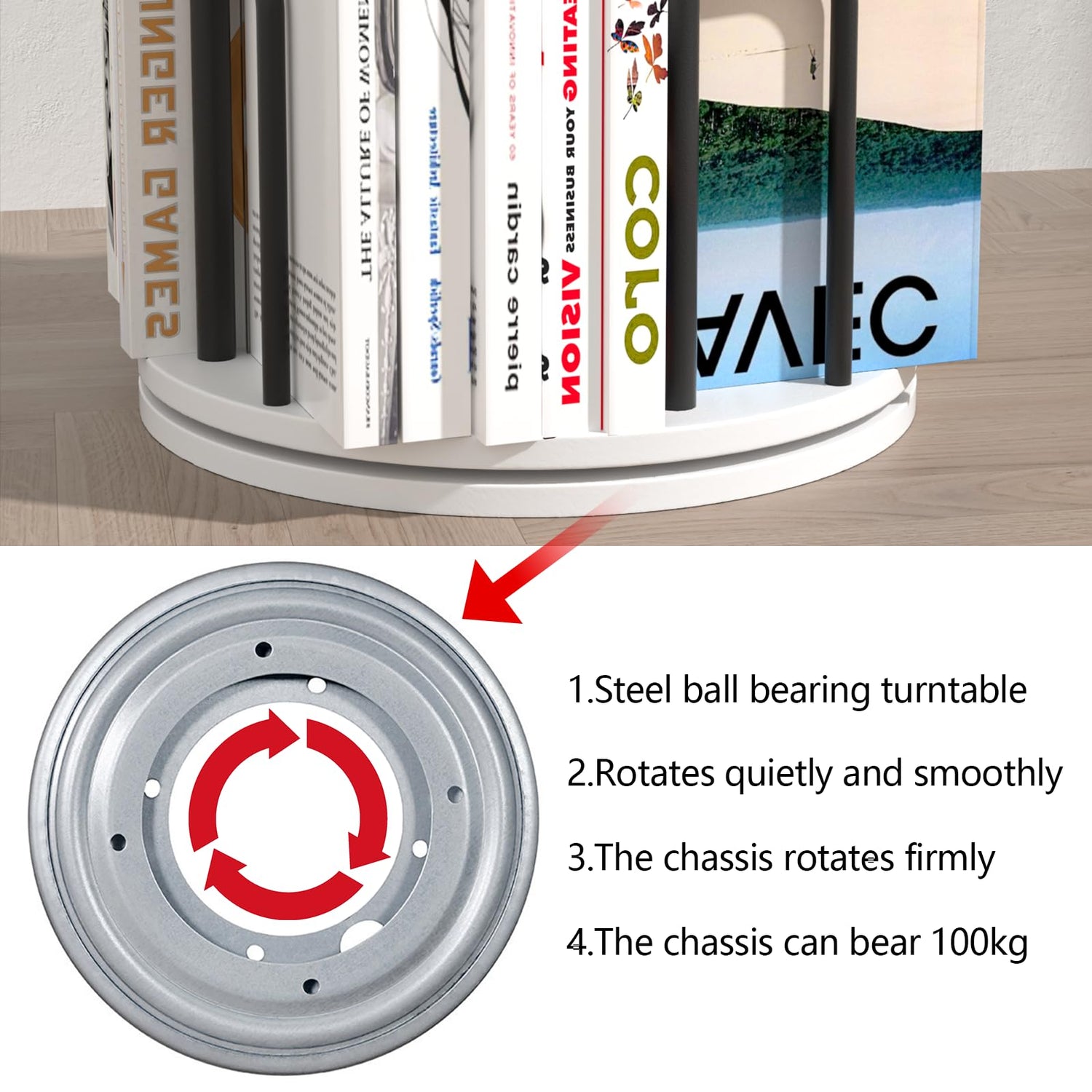 - 360 Degree Rotating Bookshelf:rotate smoothly 360 degrees in both directions,equipped with transparent baffles, making convenient to access and store.The bearings and turntable of the rotating part of the bookshelf are made of high-quality steel, which contain stronger wear resistance and corrosion resistance. Even if it carries 100 kilograms of books, it can easily and smoothly rotate.