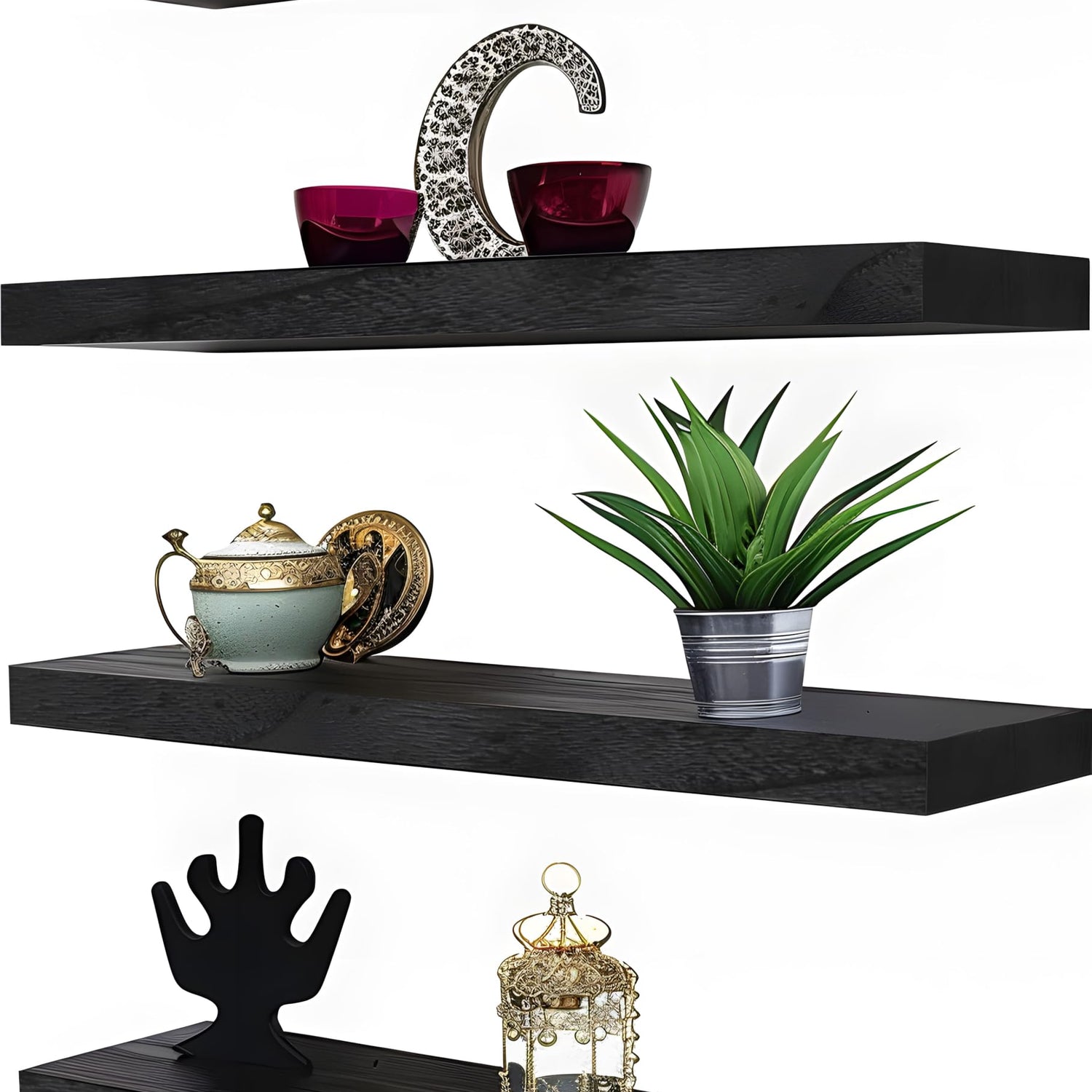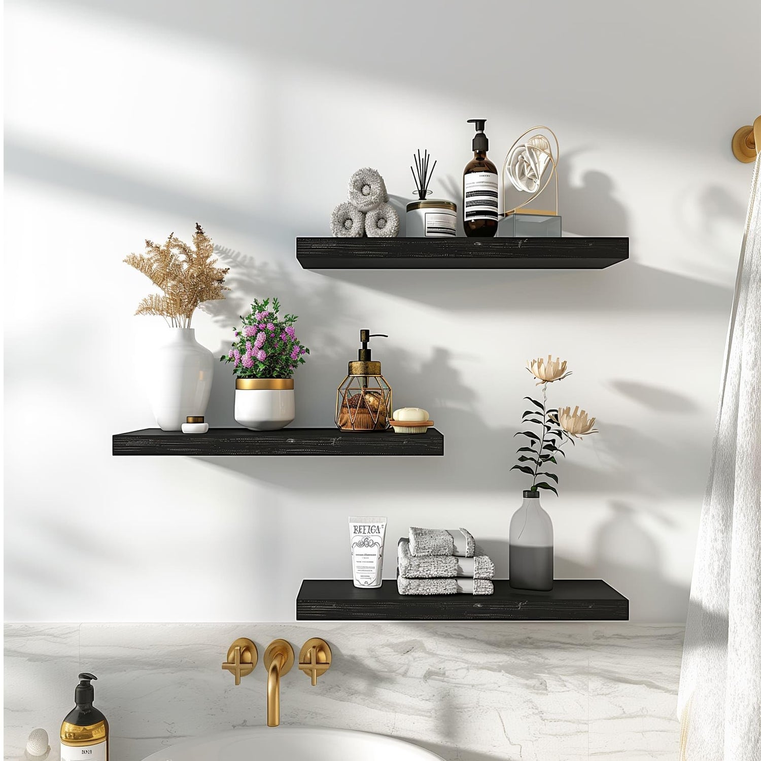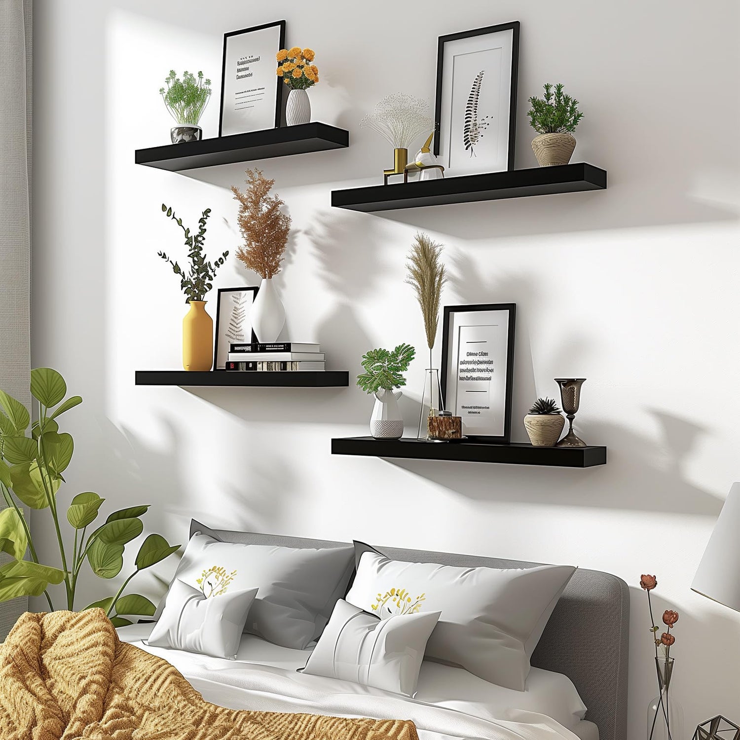 YYWUOJJ Wood Floating Shelves for Wall Decor, Rustic Wall Shelves for Bedroom Bathroom Kitchen Living Room, Set of 4 Black