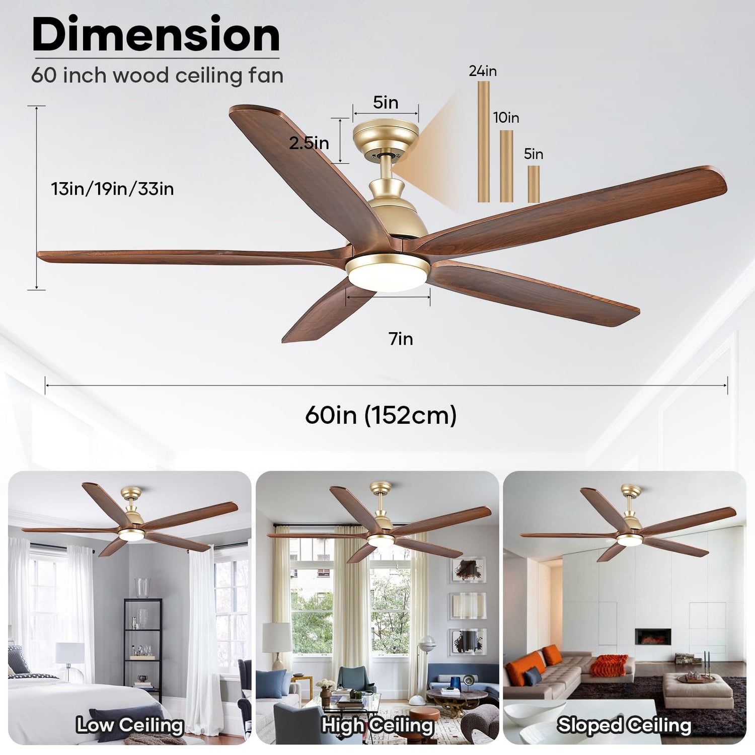 - β πππ«π π πππ’π₯π’π§π π ππ§ π°π’ππ‘ ππ’π π‘π -- 60 Inch ceiling fan rotating diameter 60 inch/1520MM, and our large ceiling fan comes with 3 sizes of gold downrods 5 inch/12.5cm and 10 inch/25cm and 24 inch/60cm are to match different ceiling heights and compatible a 25Β° sloped ceiling. YZEENM gold ceiling fan with light adopts 5 solid wood blade propeller design, which is not only beautiful and unique, but also provides a more uniform wind distribution, that the entire room can enjoy a comfortable wind.