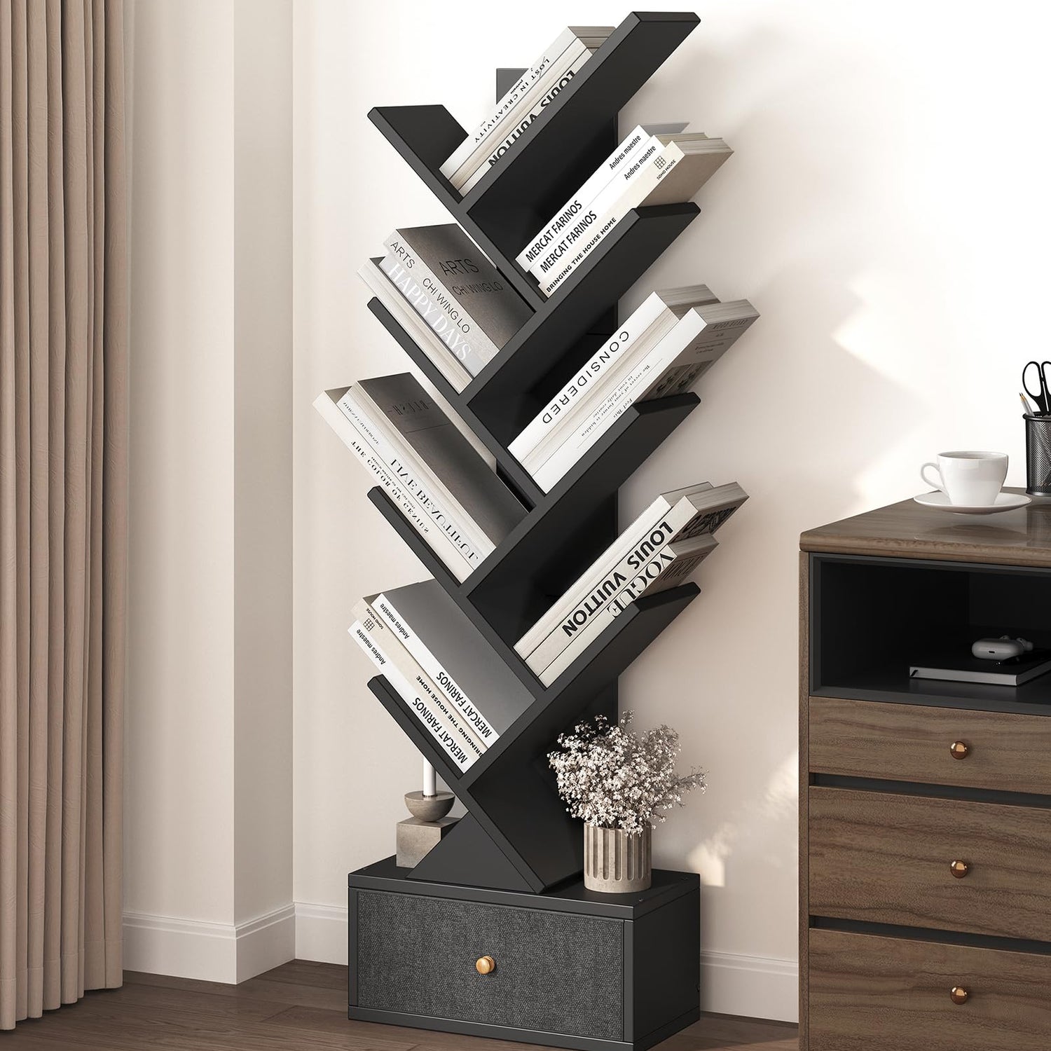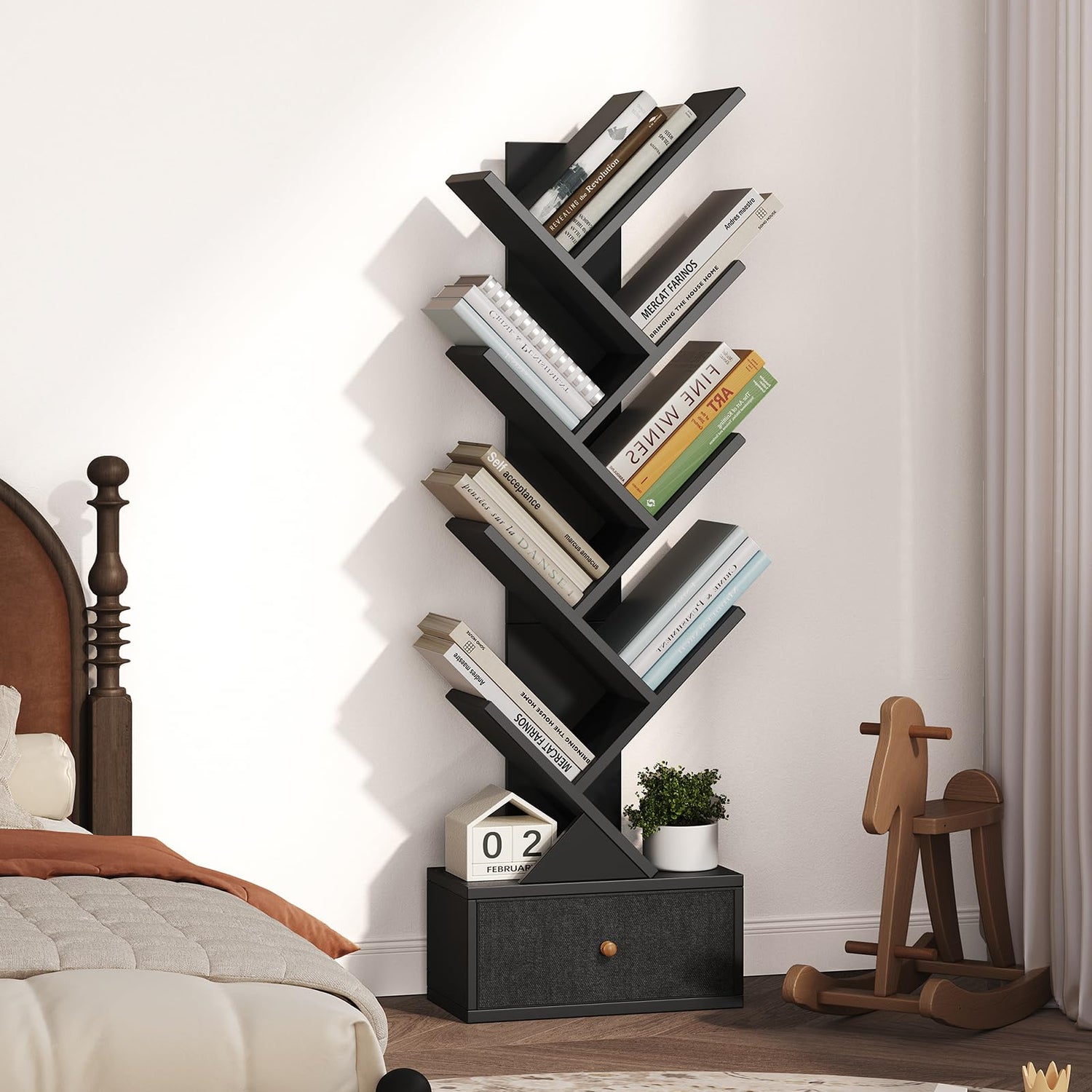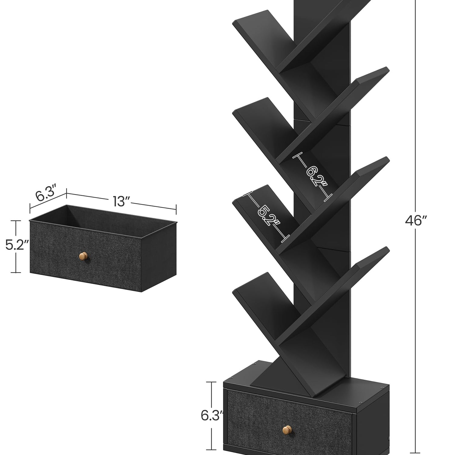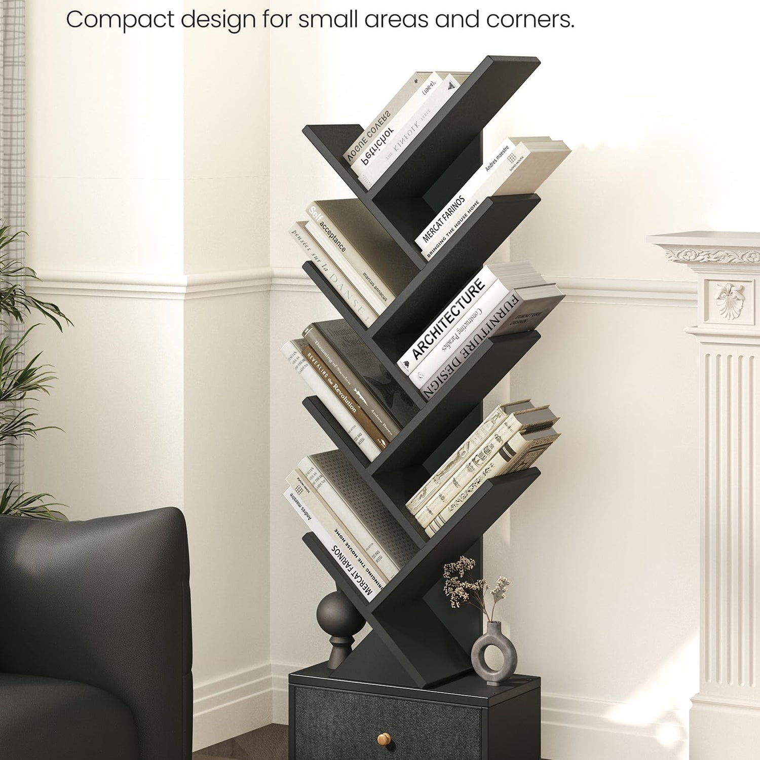 Yzosvki 9 Tier Tree Book Shelf with Drawer, Floor Standing Bookshelf Storage Organizer Bookshelves for Books/CDs, 9 Shelf Narrow Bookcase for Sturdy Room, Bedroom, Living Room, Black