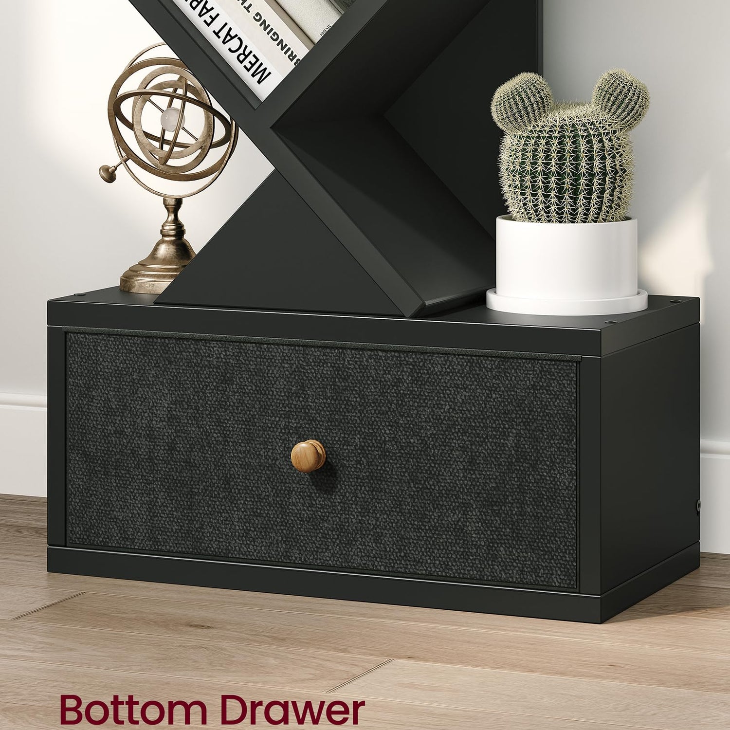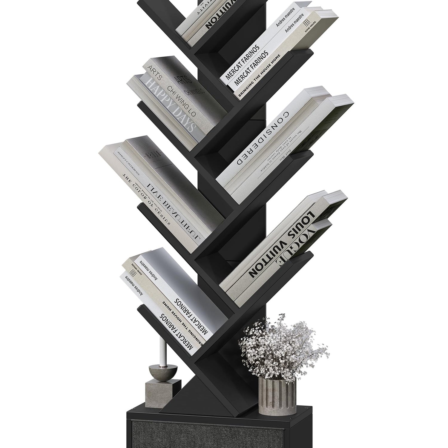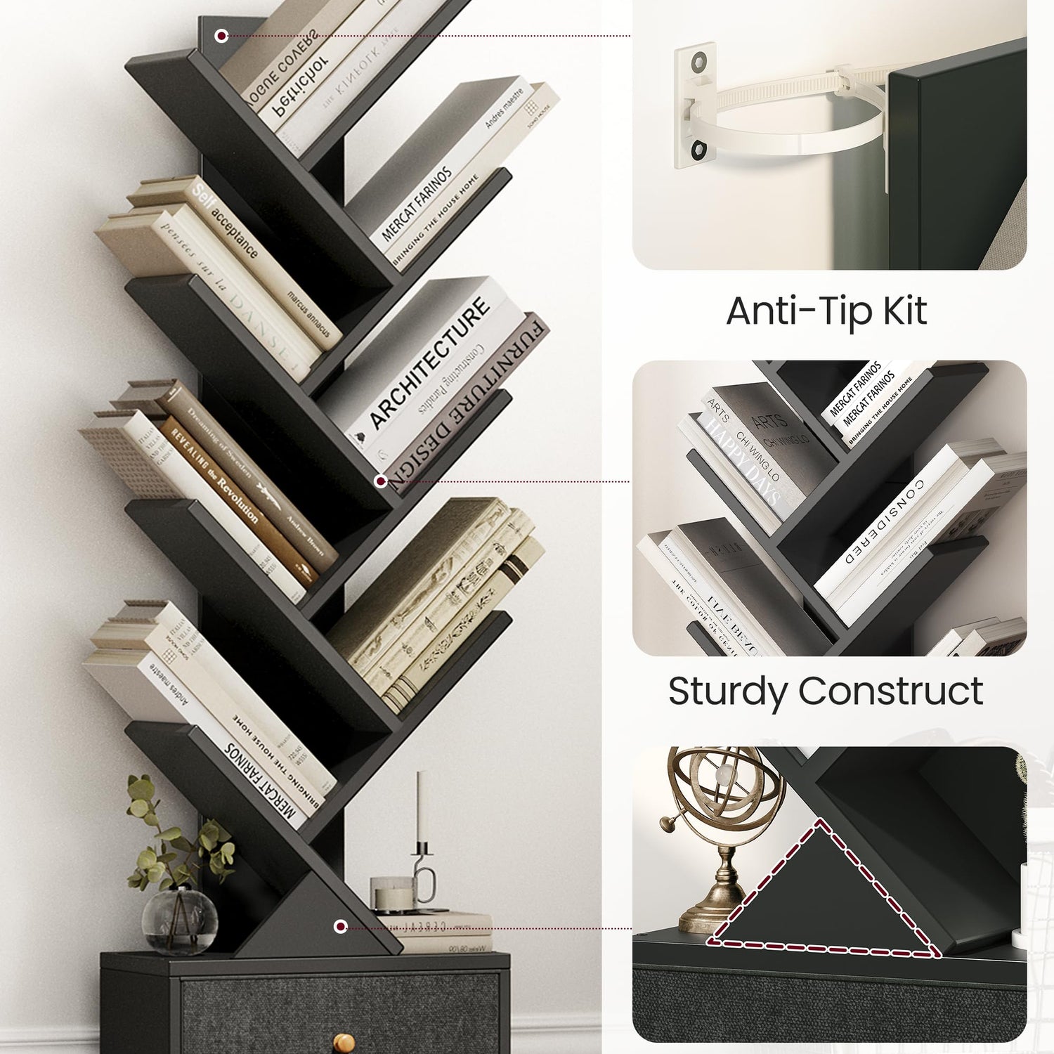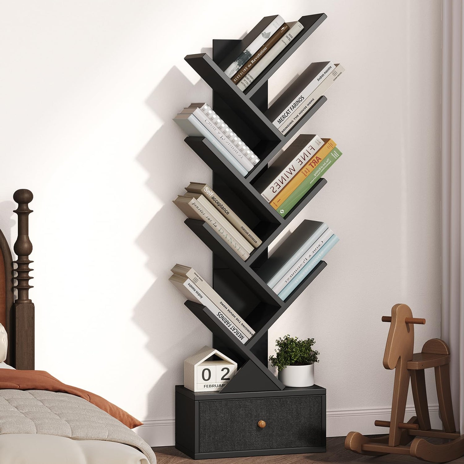 Yzosvki 9 Tier Tree Book Shelf with Drawer, Floor Standing Bookshelf Storage Organizer Bookshelves for Books/CDs, 9 Shelf Narrow Bookcase for Sturdy Room, Bedroom, Living Room, Black