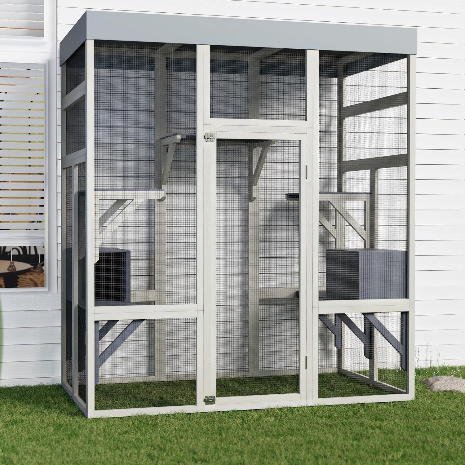 YZU 70.1" Wood Catio Outdoor Cat Enclosure Indoor Cat House with Waterproof Roof Top, 5 Platforms & 2 Resting Box, UV Resistant Gray (62.6 x 32.3 x 70.1 inches)