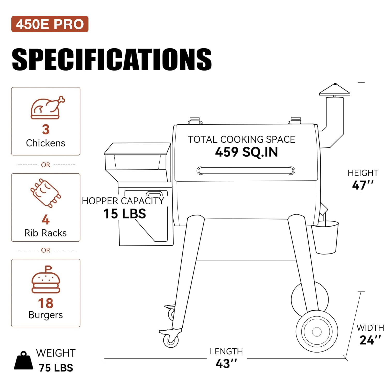 - PREMIUM FEATURES - 459 square inches of cooking space, an easy-to-clean hopper, and sturdy wheels conquer any backyard terrain, while lockable casters ensure stability during cooking sessions