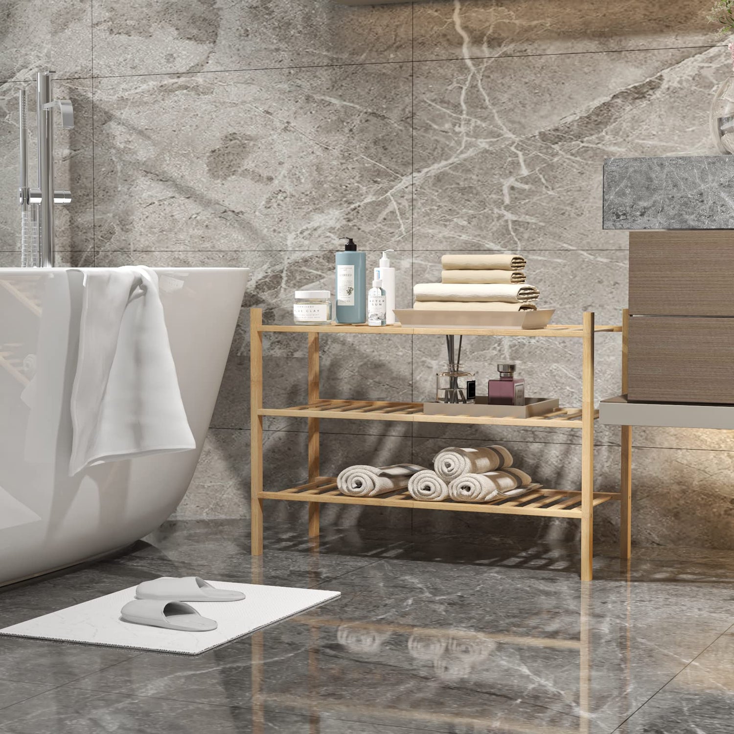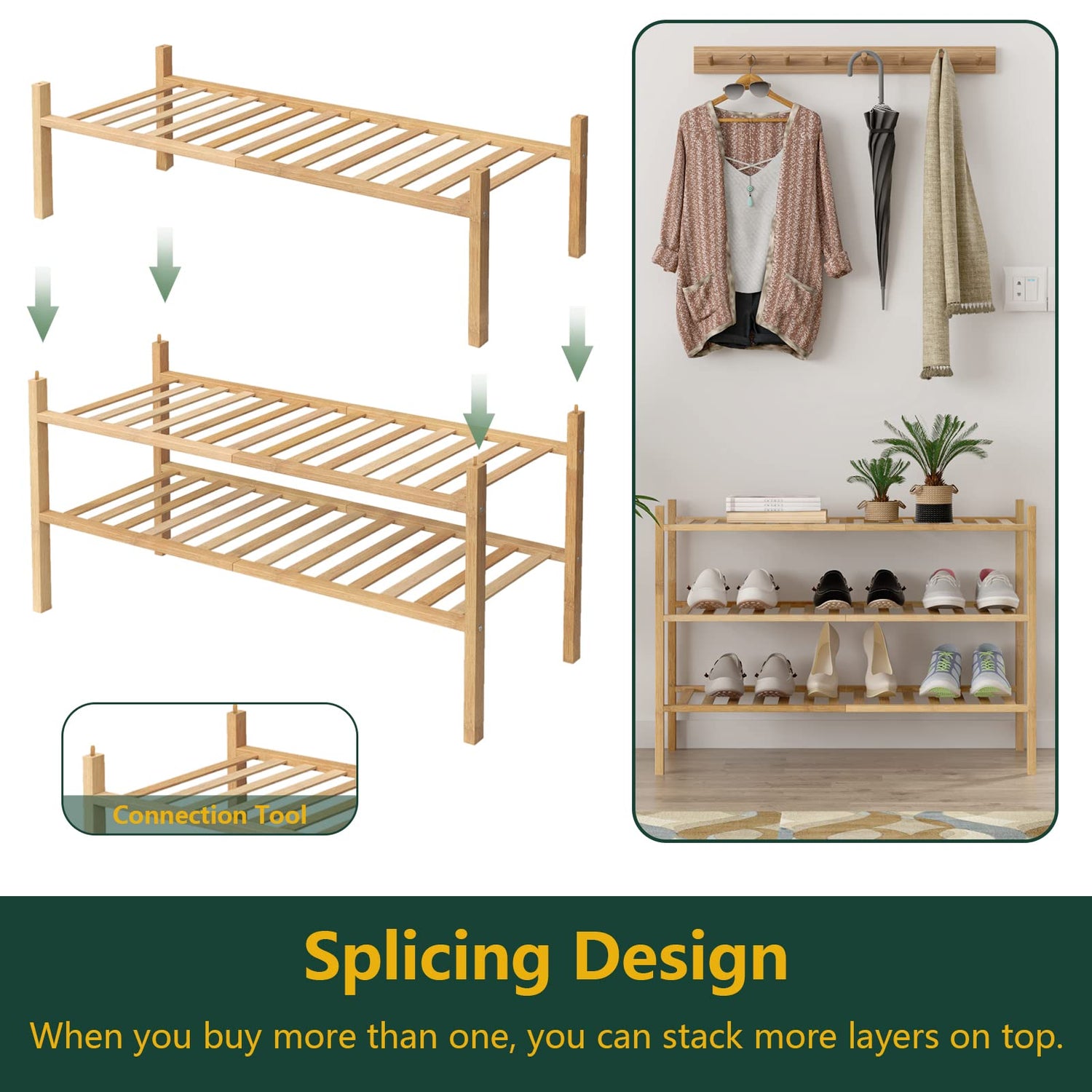 - 【STACKABLE】The bamboo shelf has a very practical splicing feature, each main pole has grooves at both ends and is connected by bamboo tips, when you have multiple shoe racks, you can stack the layers upwards to add more storage space for you.