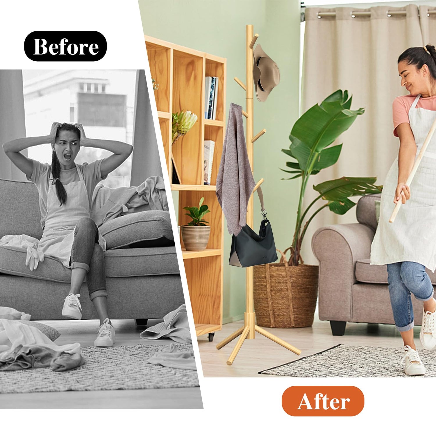 Z&L HOUSE Coat Rack Freestanding, Pure Natural Solid Wooden Coat Tree, 8 Hooks And Adjustable Height Floor Hanger, Used In The Bedroom Living Room Office To Hang Clothes, Hats, Bags