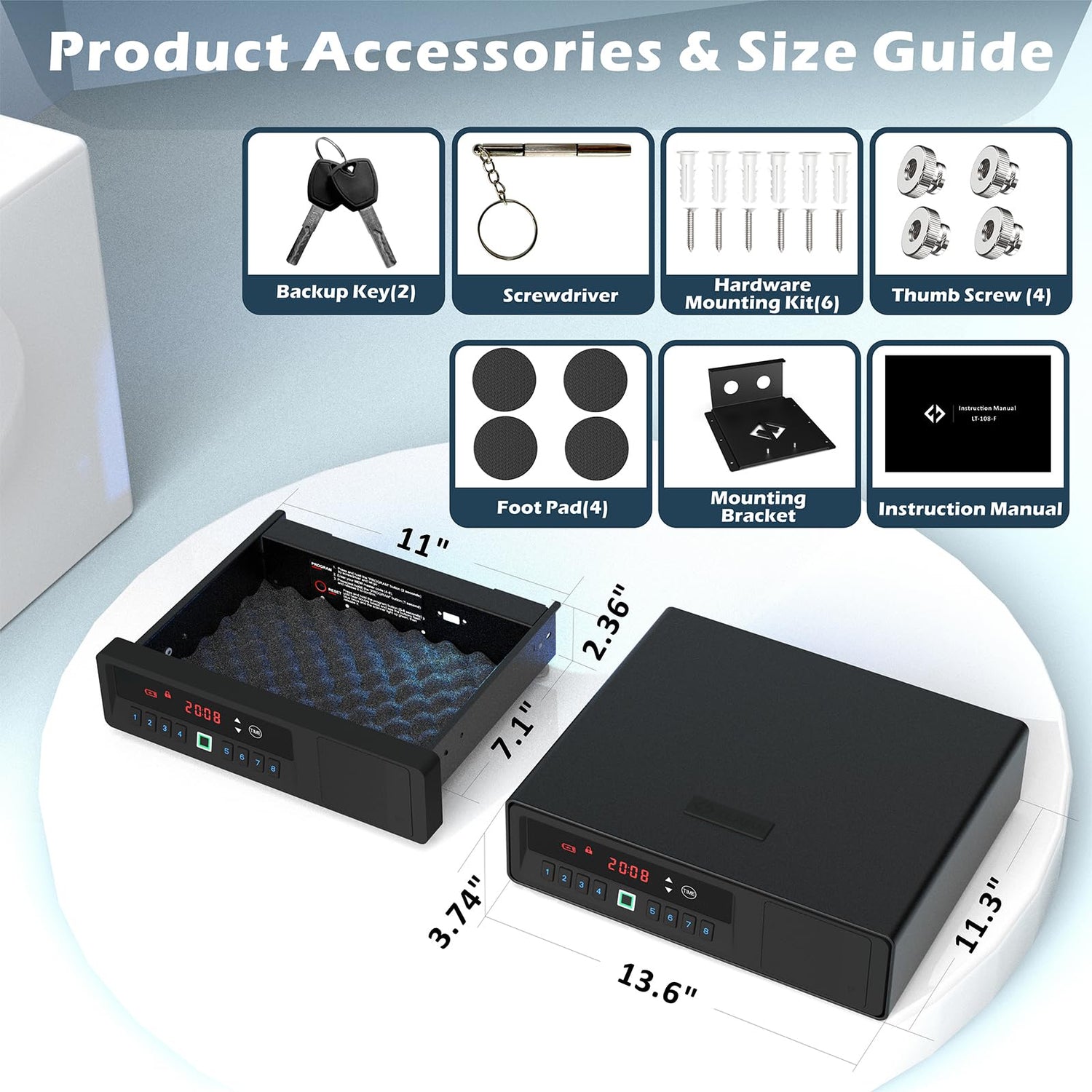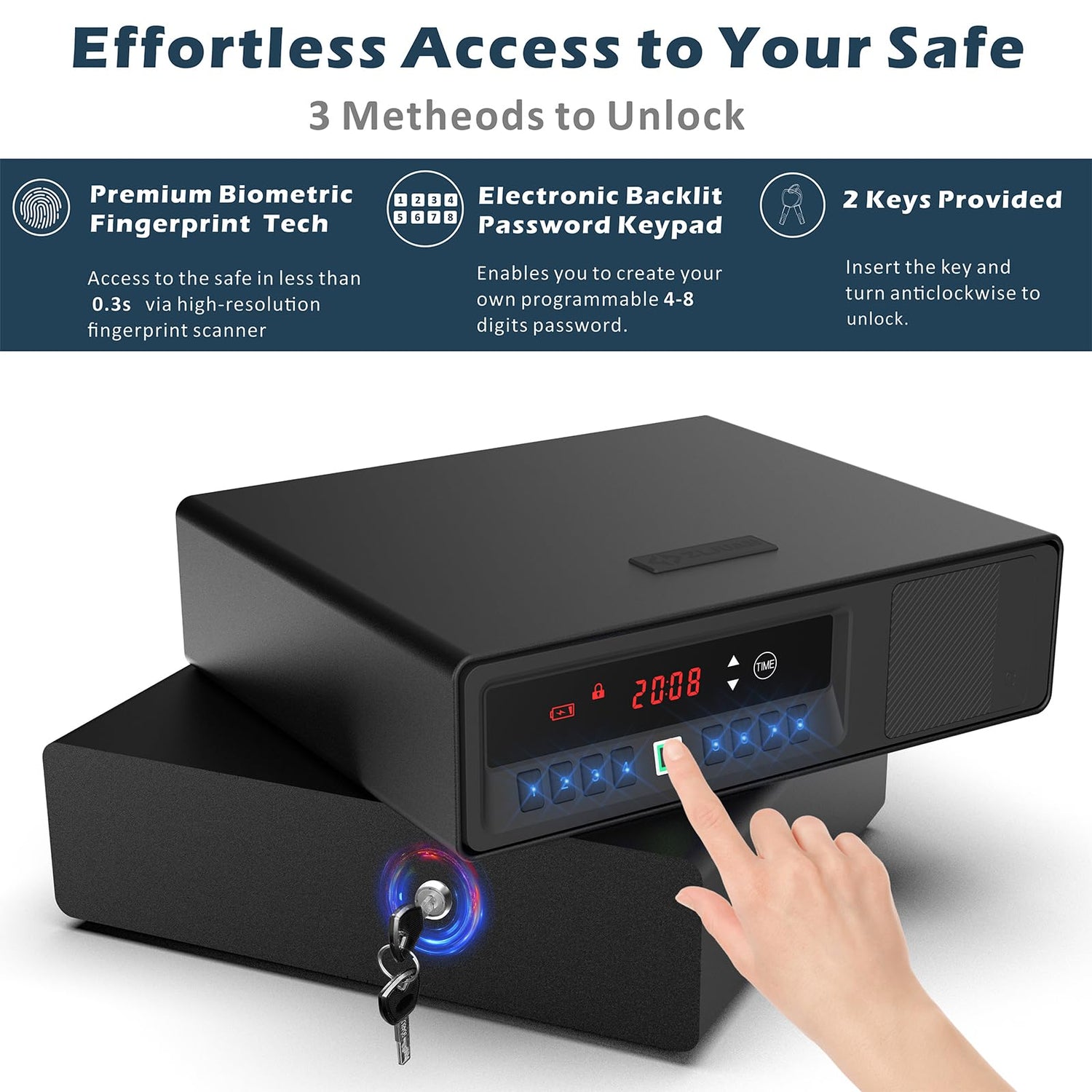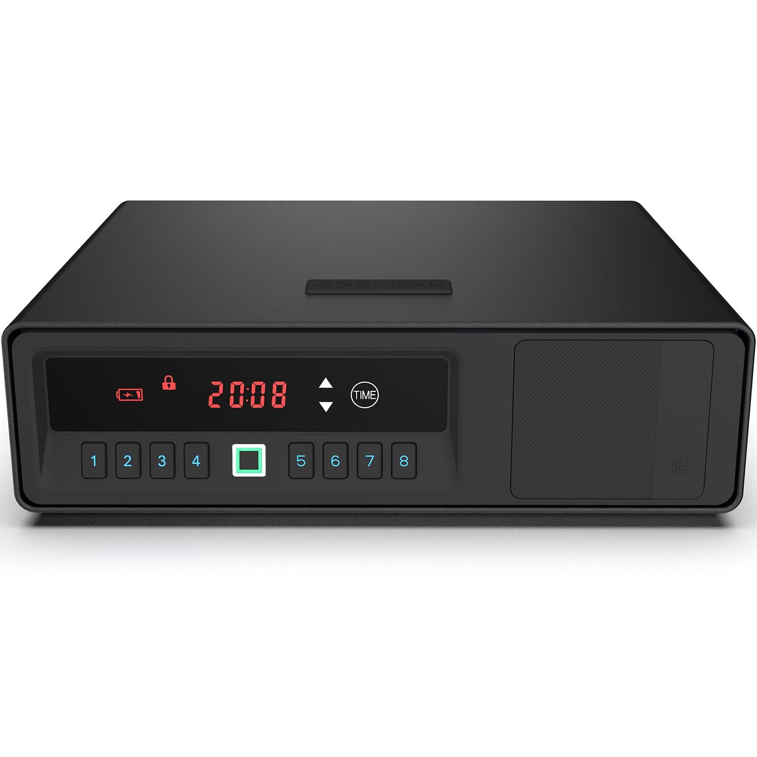 - LCD Display of Time, Low Battery Warning, Unlock State: The Drawer Biometric Fingerprint Safe keeps your handgun safes for pistols as close as your nightstand. The safe plus the additional functionality of a clock display ,low battery warning, unlock state, so you can get the unlock state, low battery & time in real-time, also you can set your time with the touch screen. Get the clear reading on the LCD display. Use it as your bedroom safe, living room safe, or closet safe