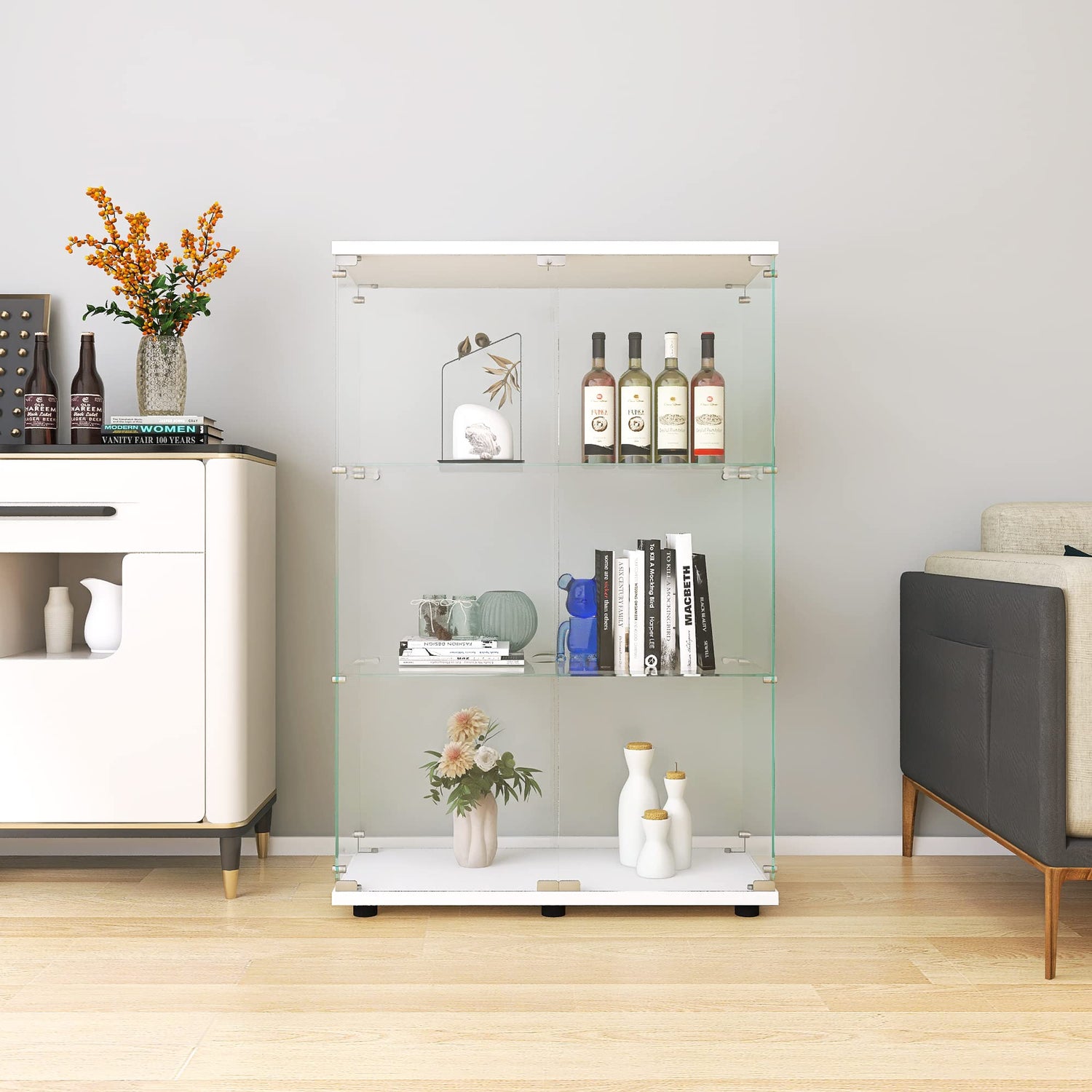 Zacis Modern Clear Glass Display Cabinet with 2 Doors and 3 Shelves for Living Room