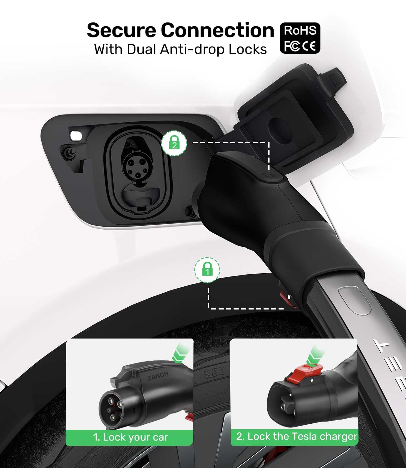 - Certified Safety: Equipped with dual anti-drop locks and CE, FCC, and RoHS certifications, it ensures a secure connection between Tesla chargers and J1772 EVs for peace of mind