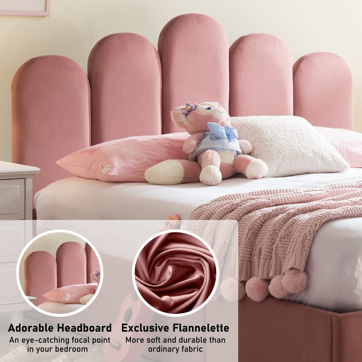 - [Adorable Headboard & Exclusive Flannelette] Featuring a large palm-shape headboard with delightful color, our bed frame would be an eye-catching focal point in your bedroom and fit a standard queen size mattress from 8 inches to 12 inches tall. Also, we use high-grade flannelette allows you to lean on the headboard for reading books or playing mobile phone comfortably, which is good for your neck and lower back since it is more soft and durable than ordinary fabric