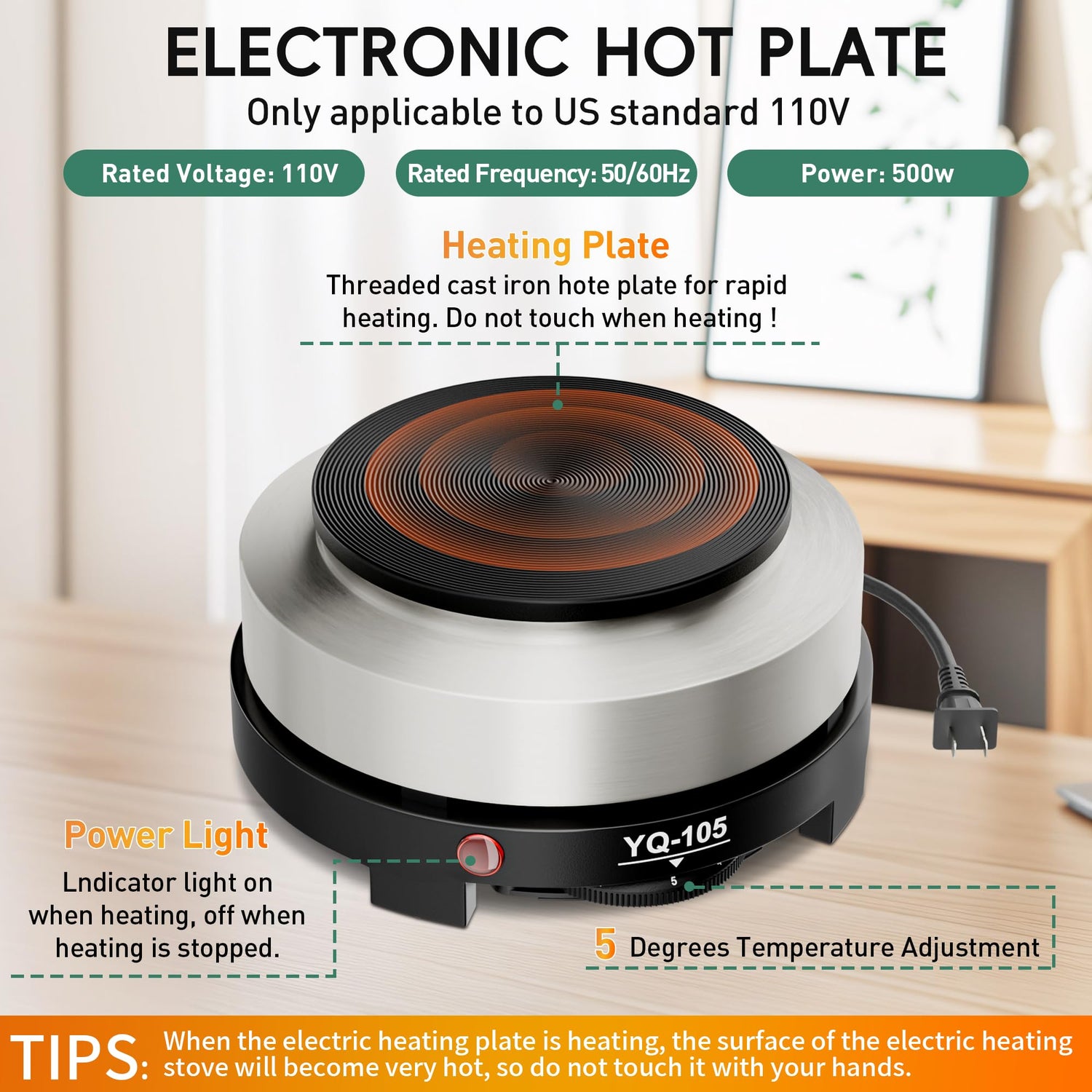 - Candle Making Kit with Hot Plate: We provide a variety of accessories to assist beginners in making perfect candles, including 900ml Stainless Steel Wax Melting Pot, 500w Hot Plate, Anti-Scald Pads, Stirring Spoon, Thermometer. The electric heating plate only supports the American standard 110V voltage
