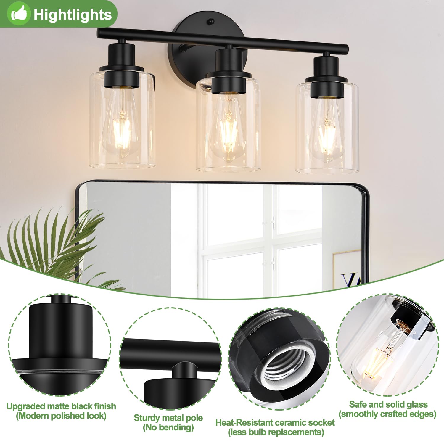 • 【Upgraded Matte Black Finish】The vanity lighting fixtures feature a sleek matte black finish lamp body accompanied by clear glass shades. The upgraded finish not only adds an elegant touch but also includes a scratch and tarnish-resistant coating, ensuring that the black bathroom light maintains its pristine appearance over time. This exquisite bathroom vanity light is suitable for various decoration styles, making it the perfect choice to enhance your home lighting.