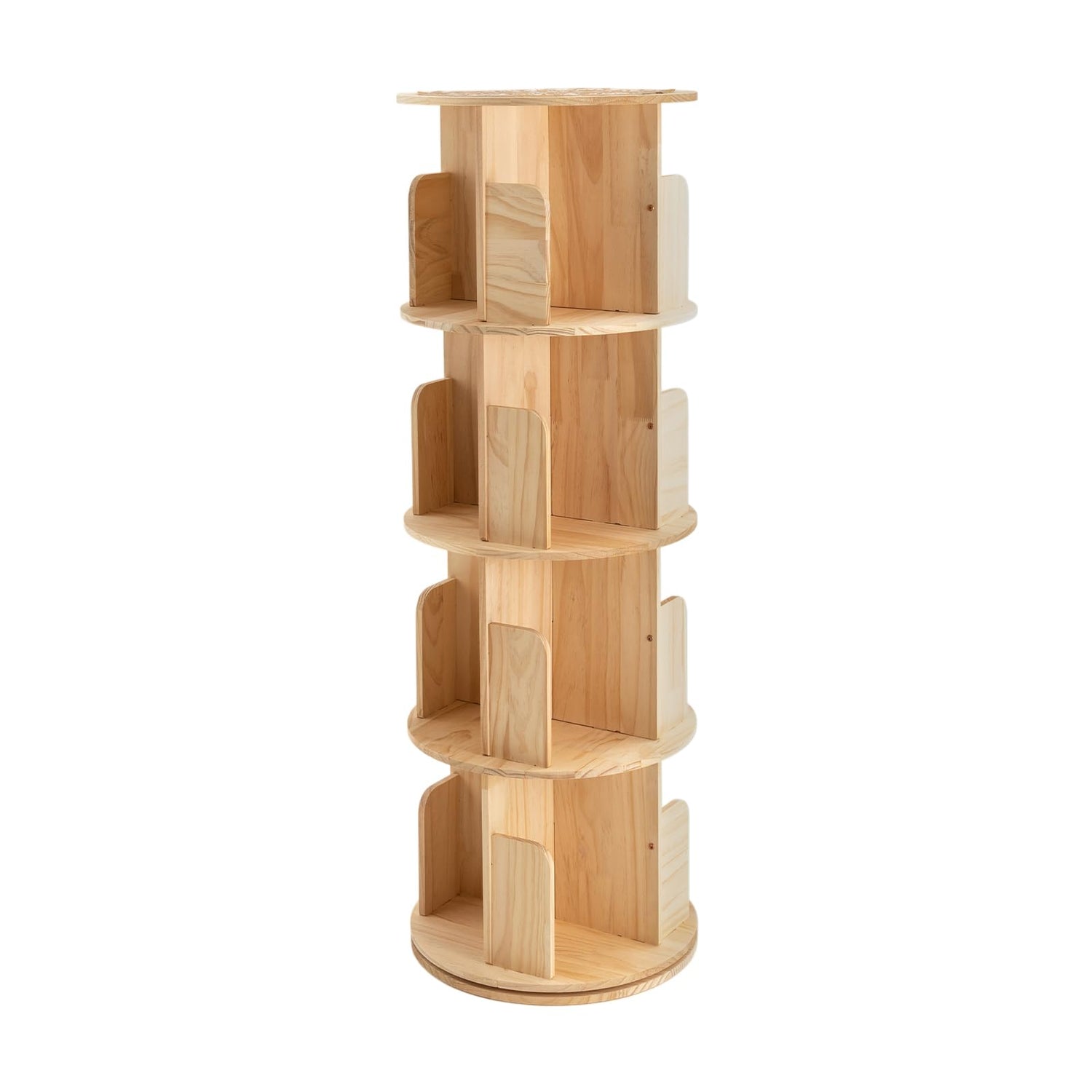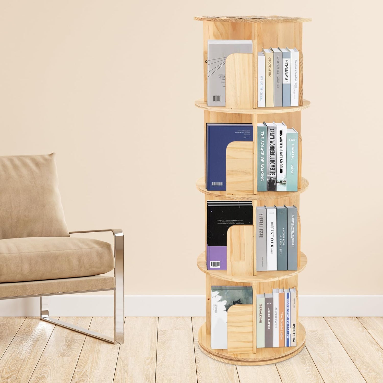 Introducing the ZAWAYINE 4-Tier 360° Rotating Wooden Bookshelf, the perfect blend of functionality and style for your living room or office. Crafted from solid pine wood, this eco-friendly bookshelf ensures a safe and healthy environment for your reading materials and precious belongings.