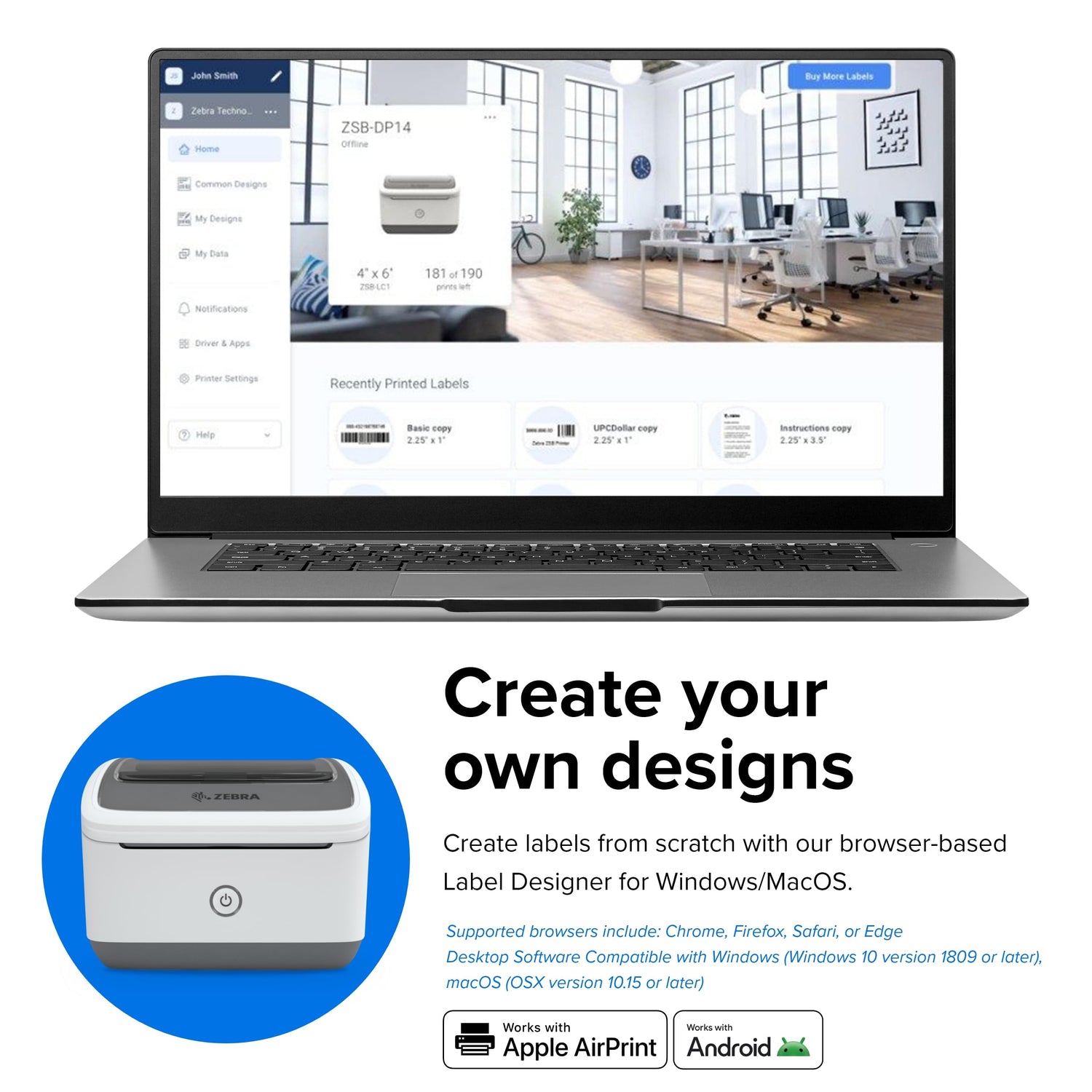 - Label Designer: the ZSB Thermal Label Printer offers flexibility in label creation. Choose from over 1,000 templates, or create custom labels from scratch, using our browser-based designer. Import data from Word, Excel, or Google Contacts