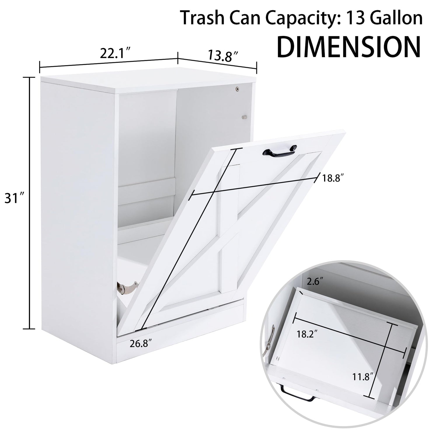 - 【SIZE& KEEP CLEAN】: 22.1"L x 13.8"W x 31.1"H (NOT include trash can). It's an exact match to a 13-gallon trash can. It's great for keeping the kitchen nice and the floor clean. This trash can cabinet will prevent odors and your pet will never knock over the trash can again.