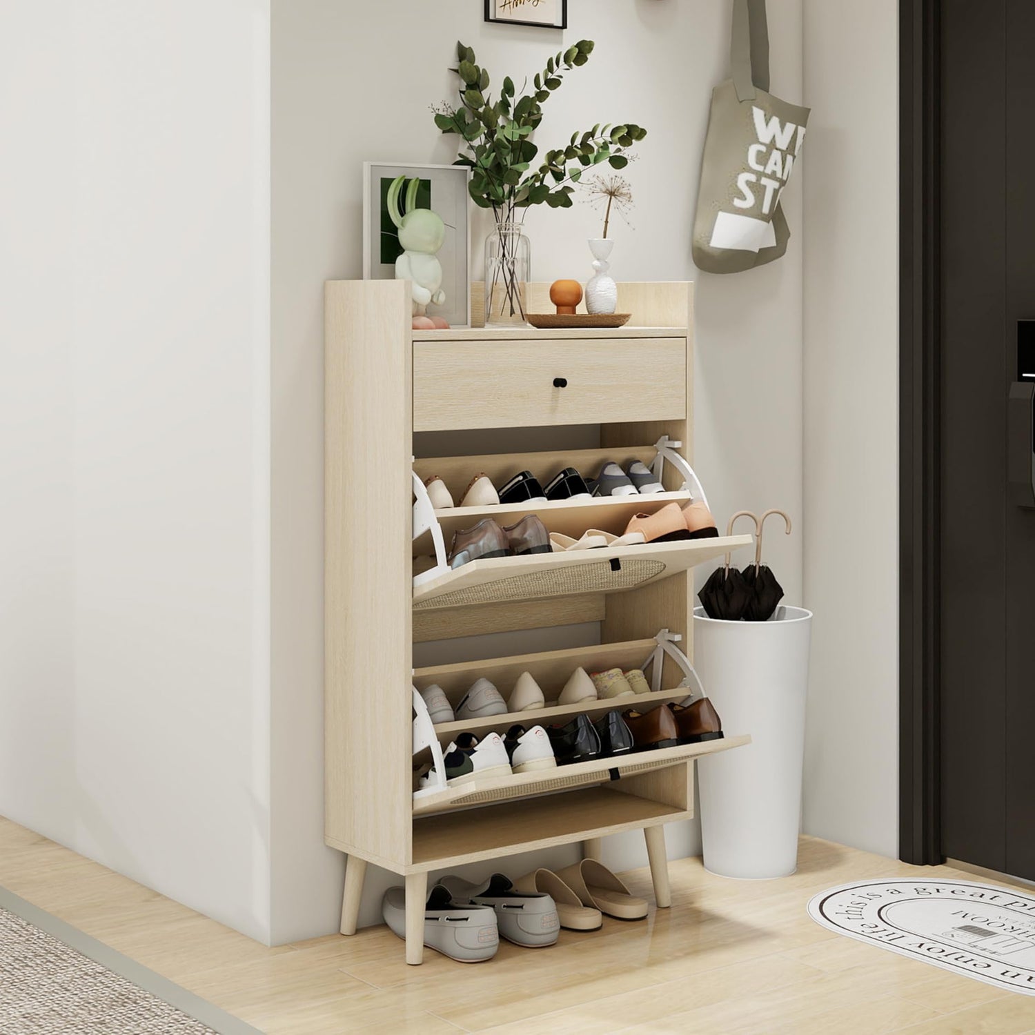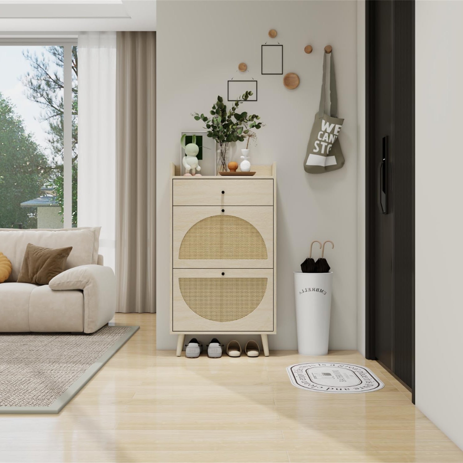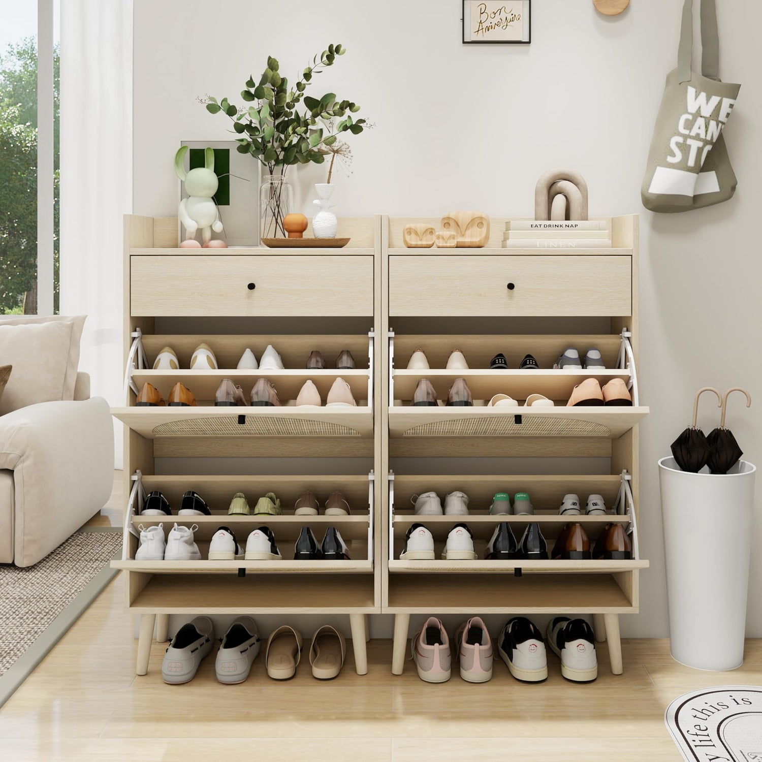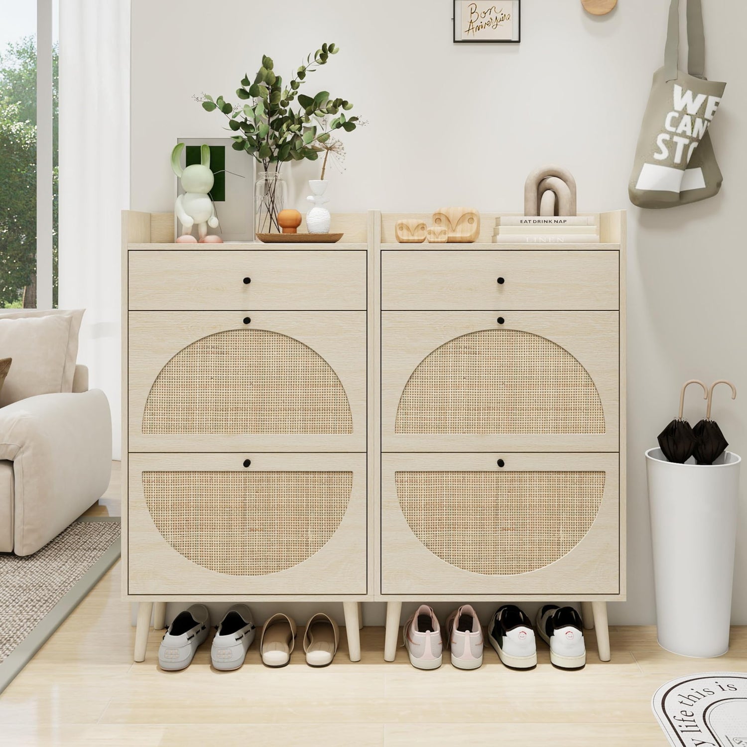 ZeHuoGe Natural Rattan Shoe Cabinet with 2 Flip Drawers, 2-Tier Shoe Rack Storage Cabinet for Heels, Slippers, Free Standing Shoe Rack for Entrance Hallway (Natural)