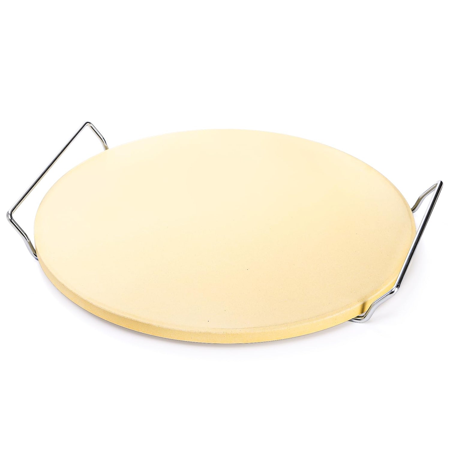 - Product Include and Size: ZENFUN round pizza stone measures 12'' diameter, 10mm thickness, and comes with a metal carry rack and a free bamboo pizza paddle which measures 15.4'' long and 11'' width. All of this will help you bake great pizza easier.