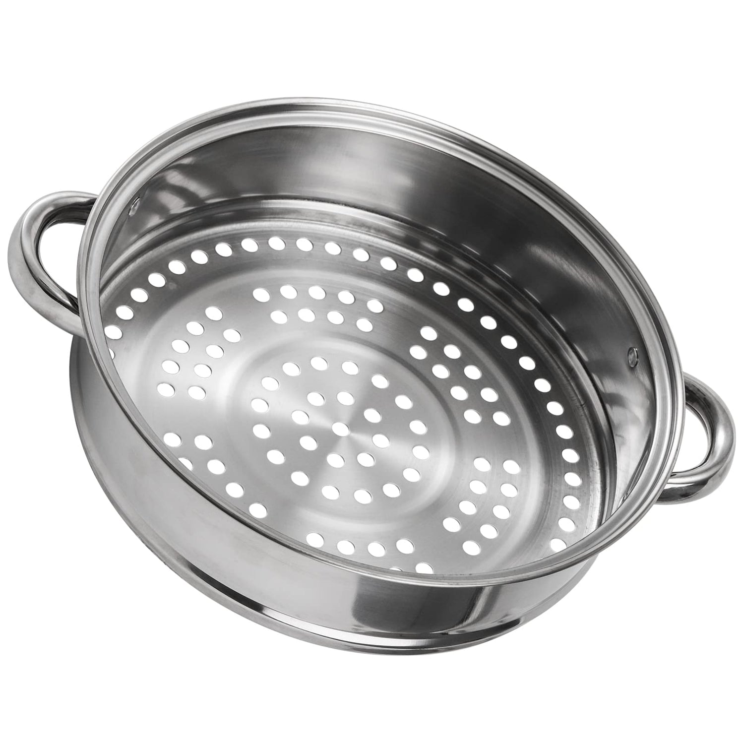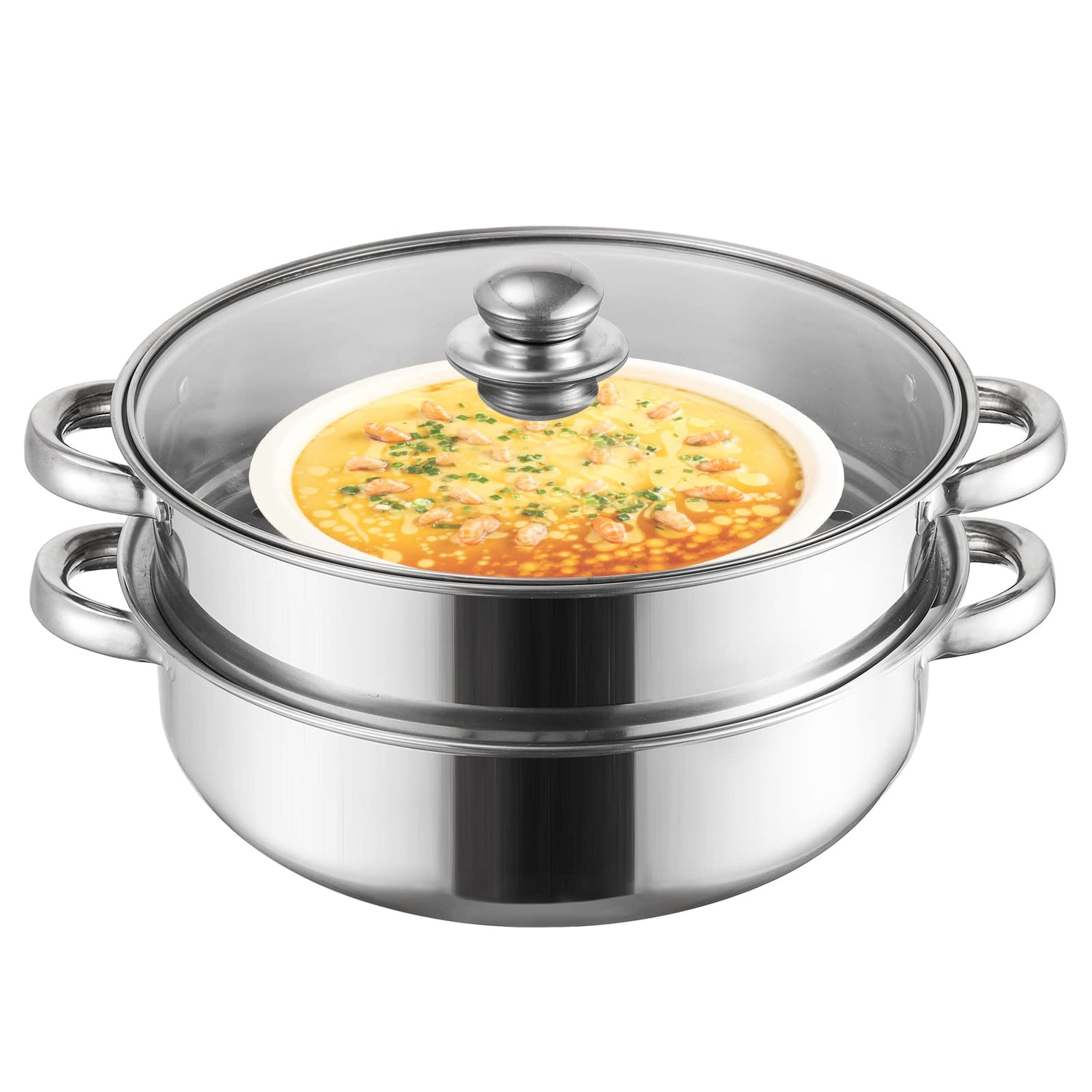 - 2 Tier Steamer Pot: Composed with one port and 2 steam lattice, you can use our pot as two tiered steamer or use the single base pan as a casserole. The steaming basket chamber in the pot has evenly distributed steaming holes, make the food heat up quickly.