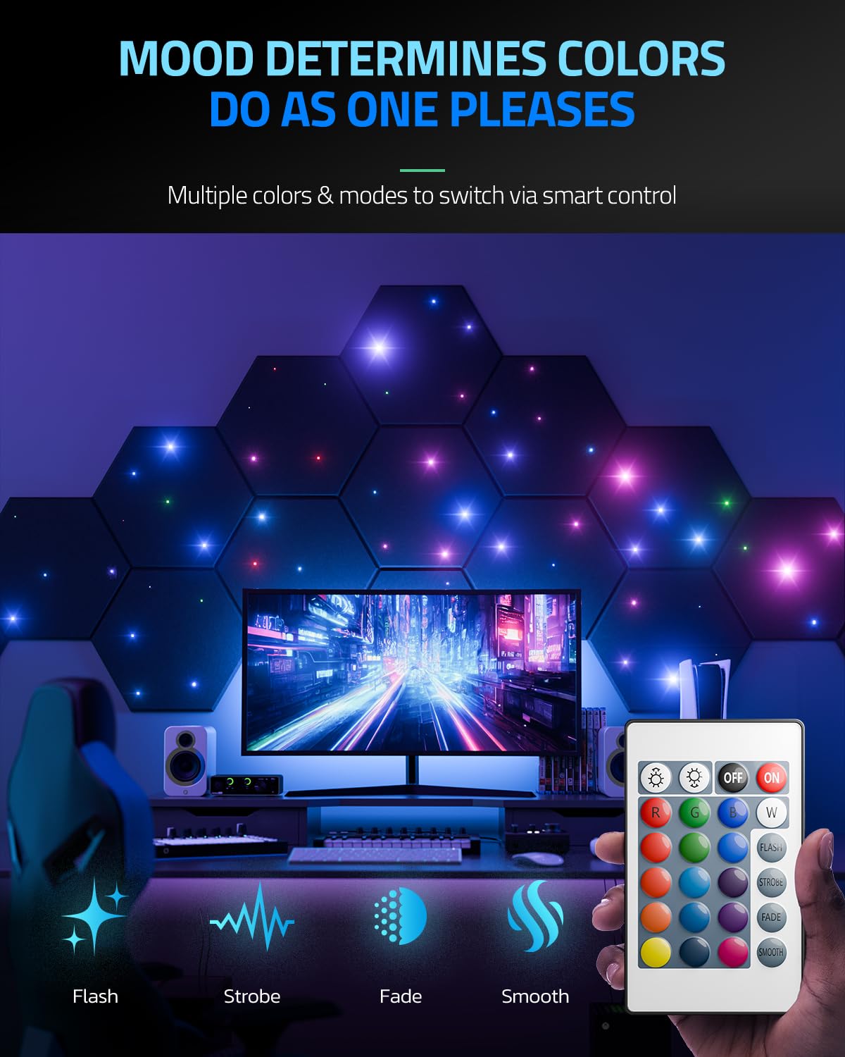 - Stylish and Versatile Design: Our decorative acoustic panels come with a 28-key remote control. The remote control comes standard with a memory function for ease of use. Easy to choose all light change modes, including static colors ,jump, fade, flash and breath mode. Combine RGB colors with white light to create other colors for a romantic starry night!