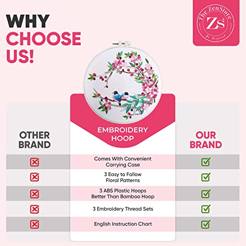 Details: The Zenstore embroidery kits for kids and adults are specially designed for beginners - with pre-printed patterns and visible stitching holes that make it easier for needles to glide through. COMPLETE EMBROIDERY SET: This embroidery starter kit includes 3x plastic embroidery hoop 7.8 inch (20 cm), 3x embroidery cloth with pattern, 7x embroidery needles, 1x sewing scissor, 1x needle threader, enough color threads and English instructions. PRE-PRINTED PATTERNS DESIGNS: The embroidery kit for beginners contains stamped embroidery patterns with colorful plants and flowers, which makes it a perfect hand embroidery kit to learn the needlework and refreshing skills. EASY TO USE: Are you a beginner or experienced embroiderer? This beginner embroidery kit for adults is perfect for both - as it comes with enough embroidery supplies & step-by-step English instructions, which can greatly help you to learn and finish the needlework. PREMIUM MATERIAL: The plastic embroidery hoop is more reliable than the bamboo hoop, and the adjustable screw is used to keep the embroidery fabric as super tight. ZenStore embroidery kits for adults beginners come in a special packaging bag which enables you to carry it anywhere or make a meaningful gift to your loved ones. PRECIOUS DECORATION & GIFT: The embroidery kit can add more artistic flavor to your home decor. It's an ideal parent-child activity to develop a supportive relationship and you can also make it as a meaningful suitable gift for special occasions