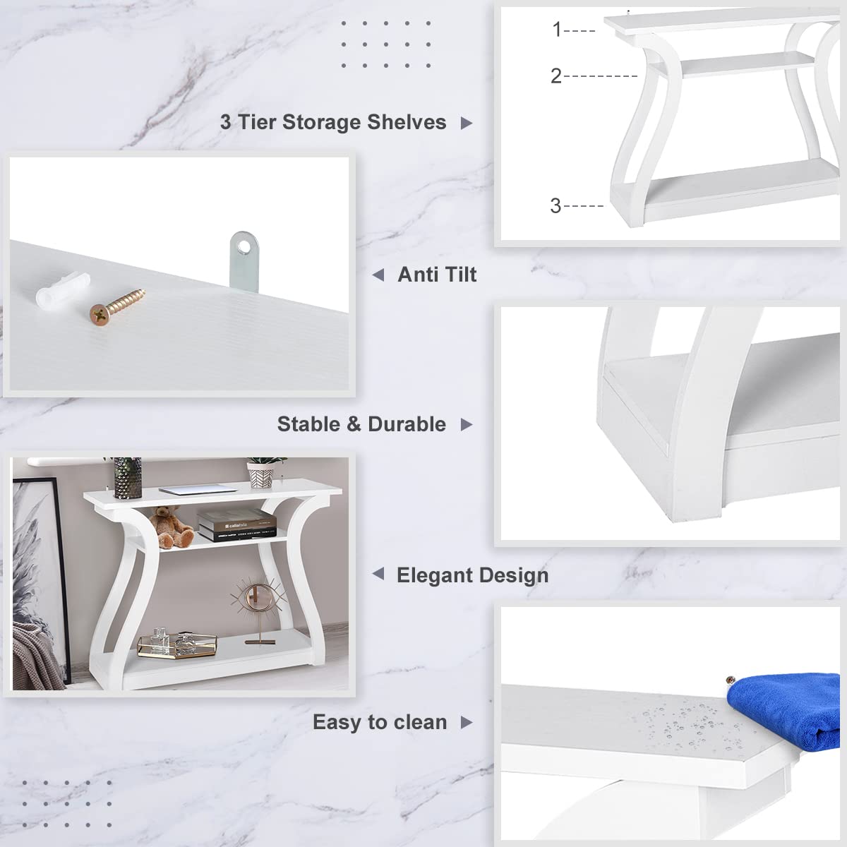 - 【High-quality】--Constructed of premium SOLID MDF WOOD, this sleek hall console table features an unique curved base, sturdy and high quality to use; Weight Capacity: up to 66 pounds each shelf; The surface is finished in a white wood color, with the tough coating makes it resistant to scratches and has better skid resistance, which will complete the stylish look of your living space and promises a long service life