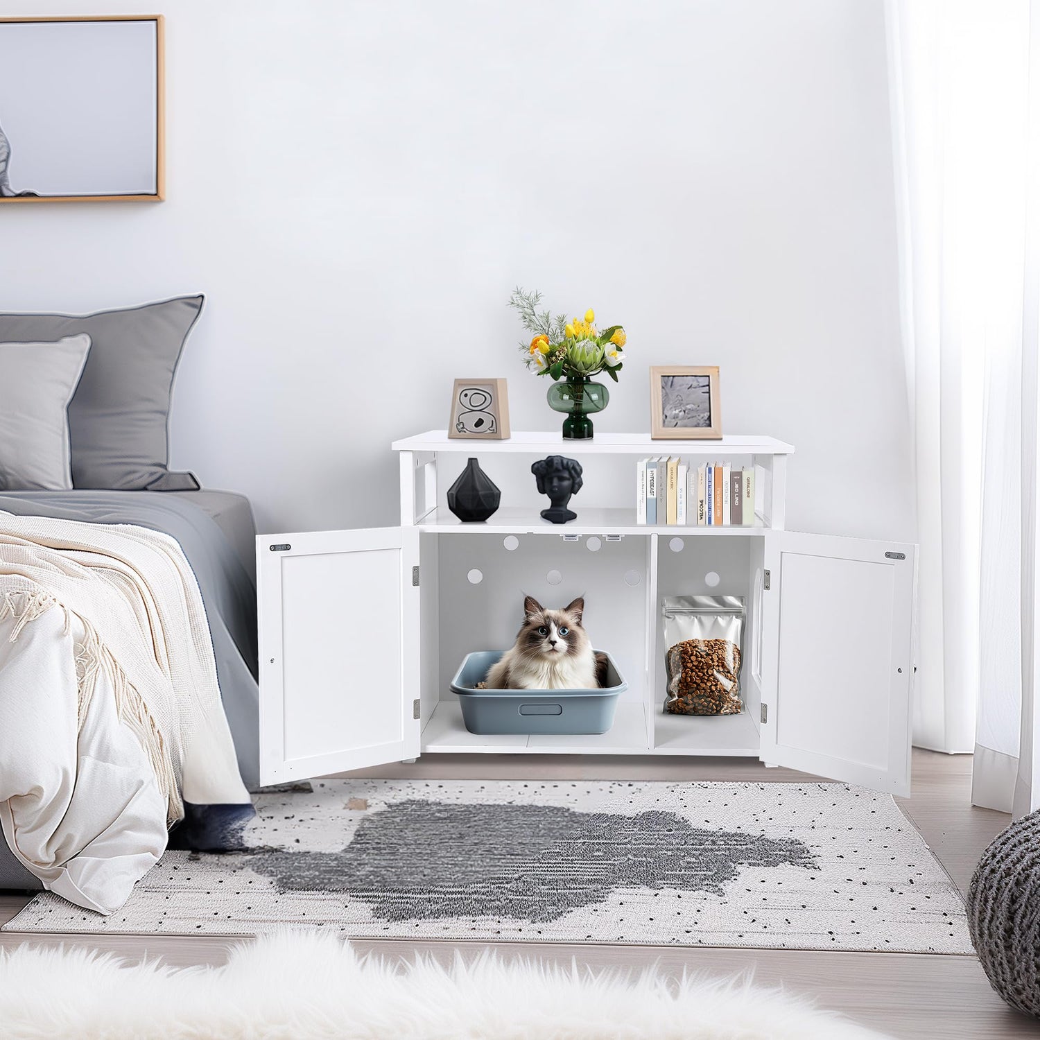 ZENY Cat Litter Box Enclosure, Cat Litter Box Furniture Hidden with Open Shelf, Wooden Cat Litter Cabinet with Divider, Indoor Cat Washroom Storage Bench, White