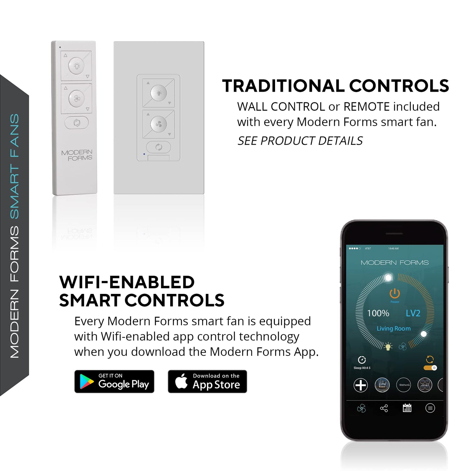 - APP CONTROLLED: Sync with our exclusive Modern Forms app to control fan speed, use smart features like breeze mode, adaptive learning, create groups, and reduce energy costs. New: Bluetooth compatible for improved range and an unlimited amount of fans can be controlled with remote or wall control within range.
