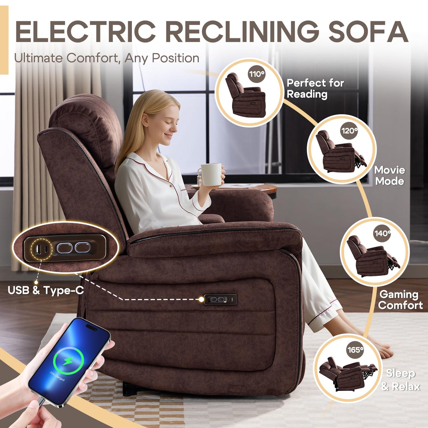 • Smooth Electric Recline & Charging Options: Each seat operates with an independent quiet motor, reclining up to 165° with smooth movement. Built-in USB and Type-C charging ports keep devices powered, so you can enjoy movies or naps without leaving your sofa