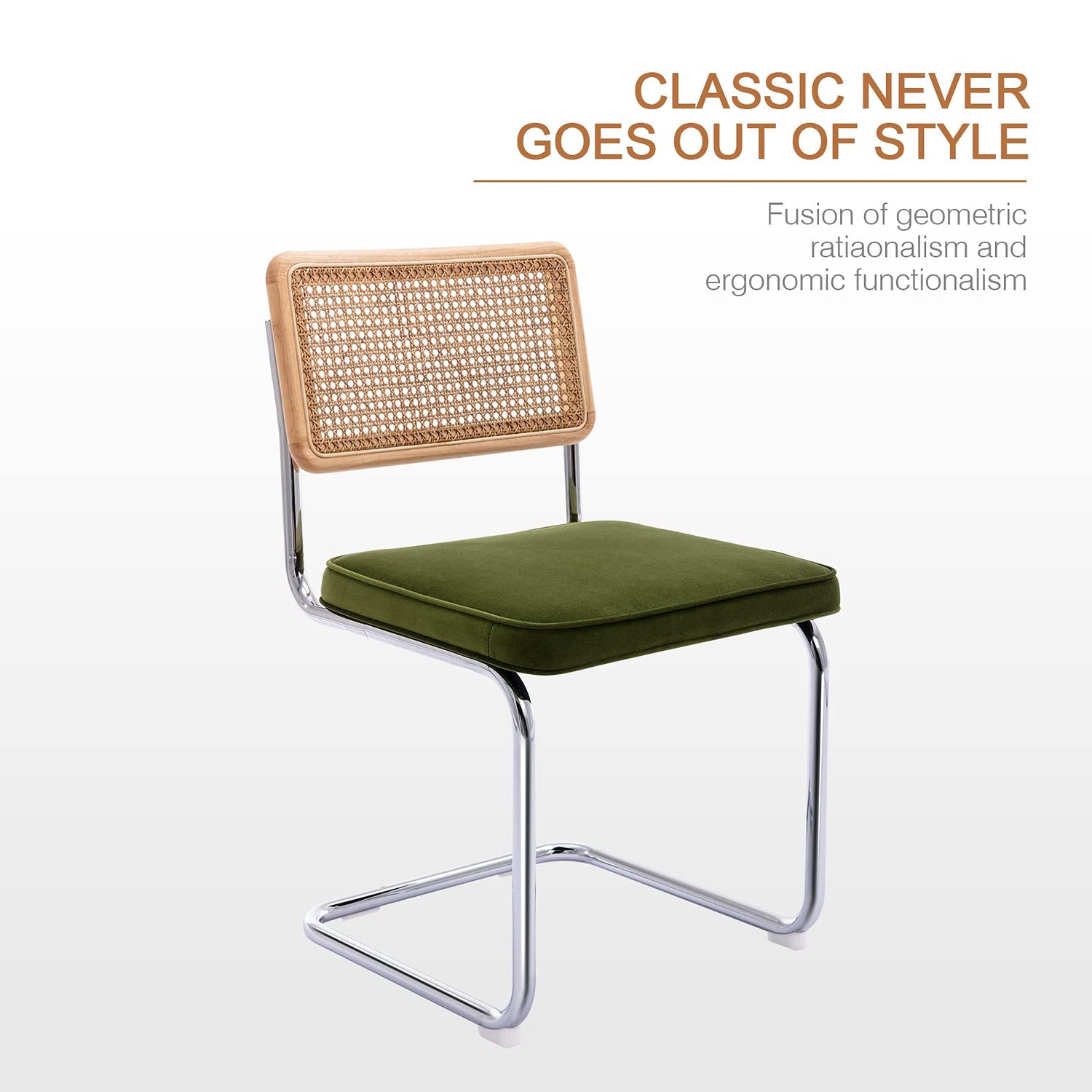 Zesthouse Dining Chairs Set of 4, Velvet Accent Chairs with Natural Cane Back & Stainless Chrome Base, Modern Mid Century Breuer Designed Chairs, Upholstered Rattan Dining Room Kitchen Chairs