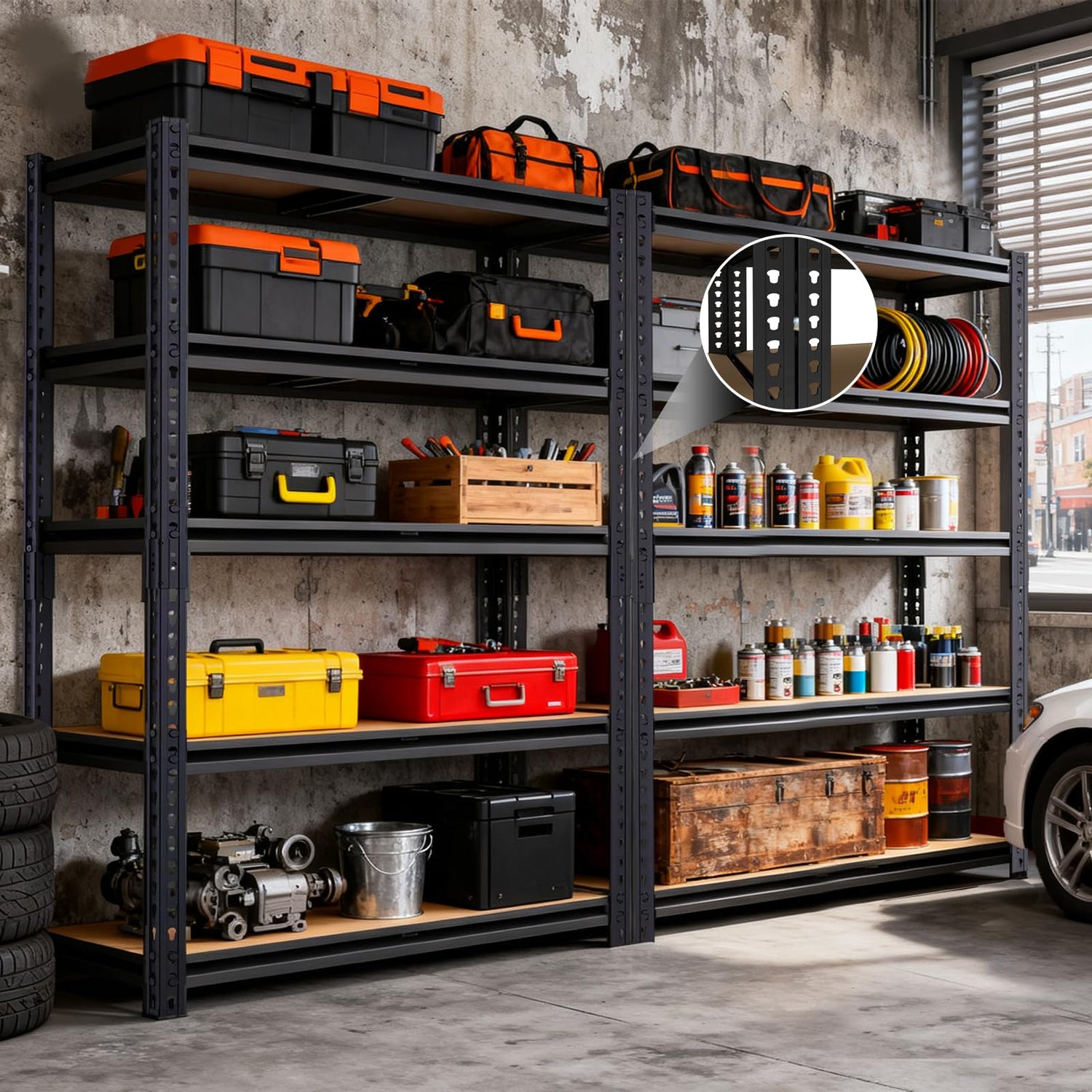 - 【Adjustable Garage Shelves Spacing】 The distance between pantry shelves can be freely adjusted. Using the column hole design, you can easily adjust the storage shelf rack spacing according to the height of the items, achieving personalized storage.