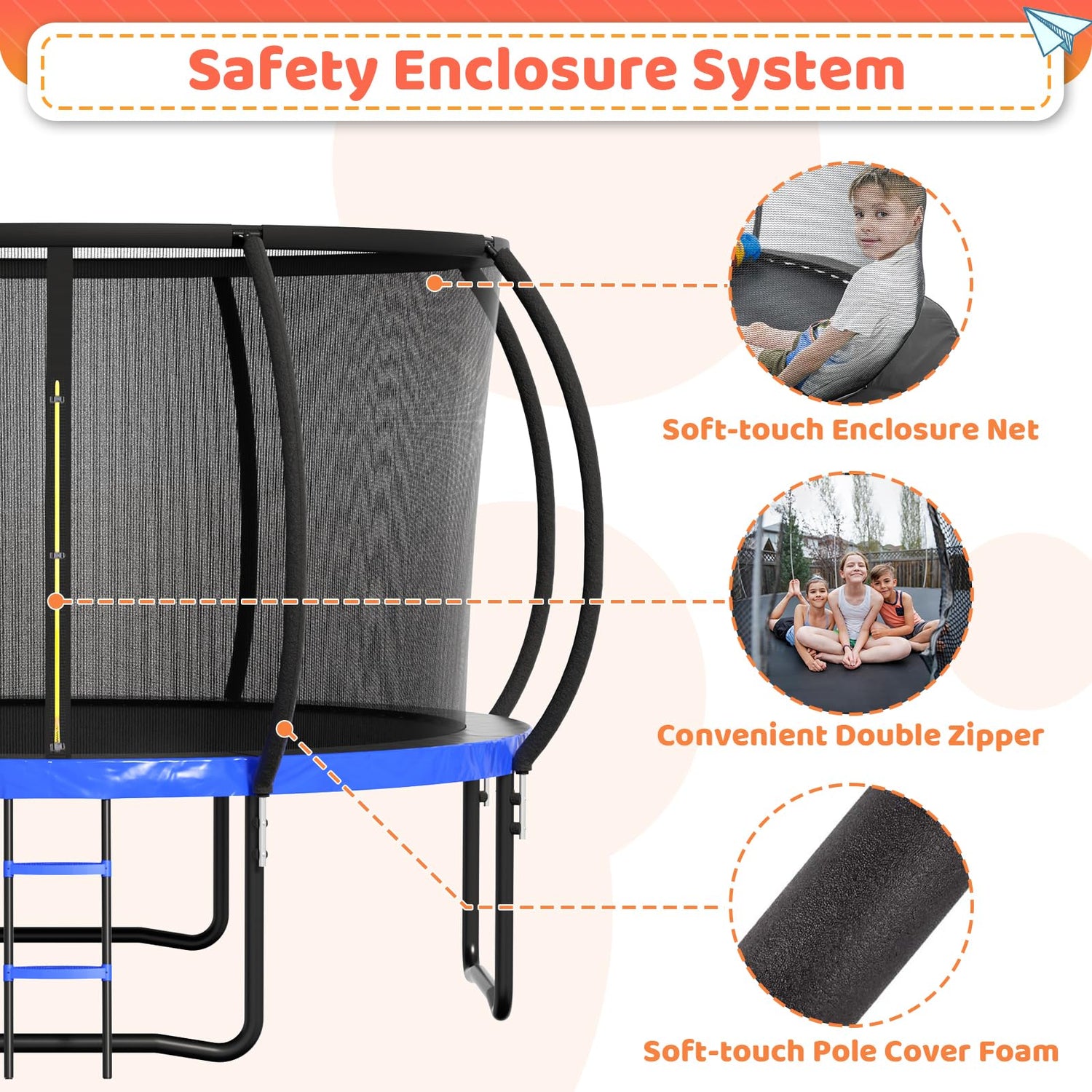 - 【ASTM Approved】Our 12 ft trampoline meets the safety standards of ASTM F381-16. With thick foam coverage on all poles, our trampoline eliminates safety concerns and ensures fun jumps without injuries.