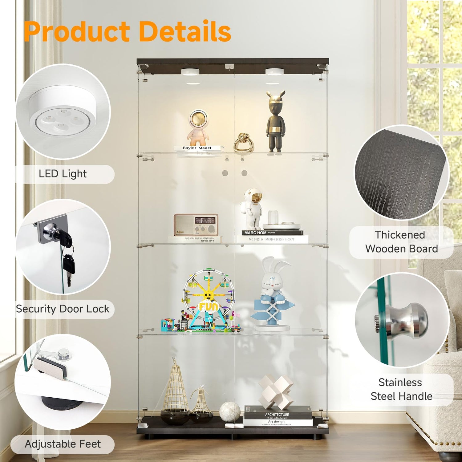 - 【Large Capacity】With a large size of 30.91" x 13.58" x 64.69" and four sturdy shelves, this glass display cabinet offers generous room to organize and showcase a wide variety of items—whether it's figurines, ornaments, decor, jewelry, handbags, shoes, souvenirs, toys, trophies, or books