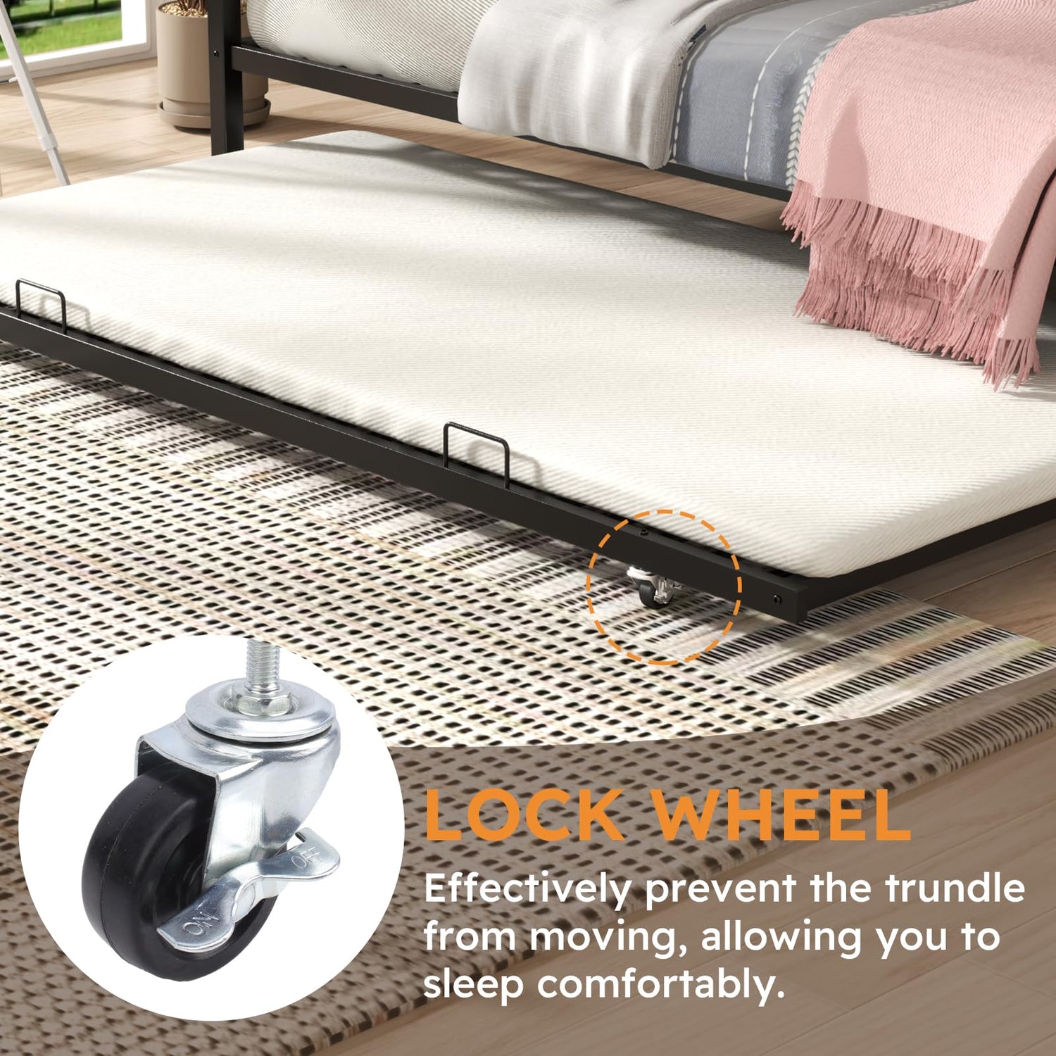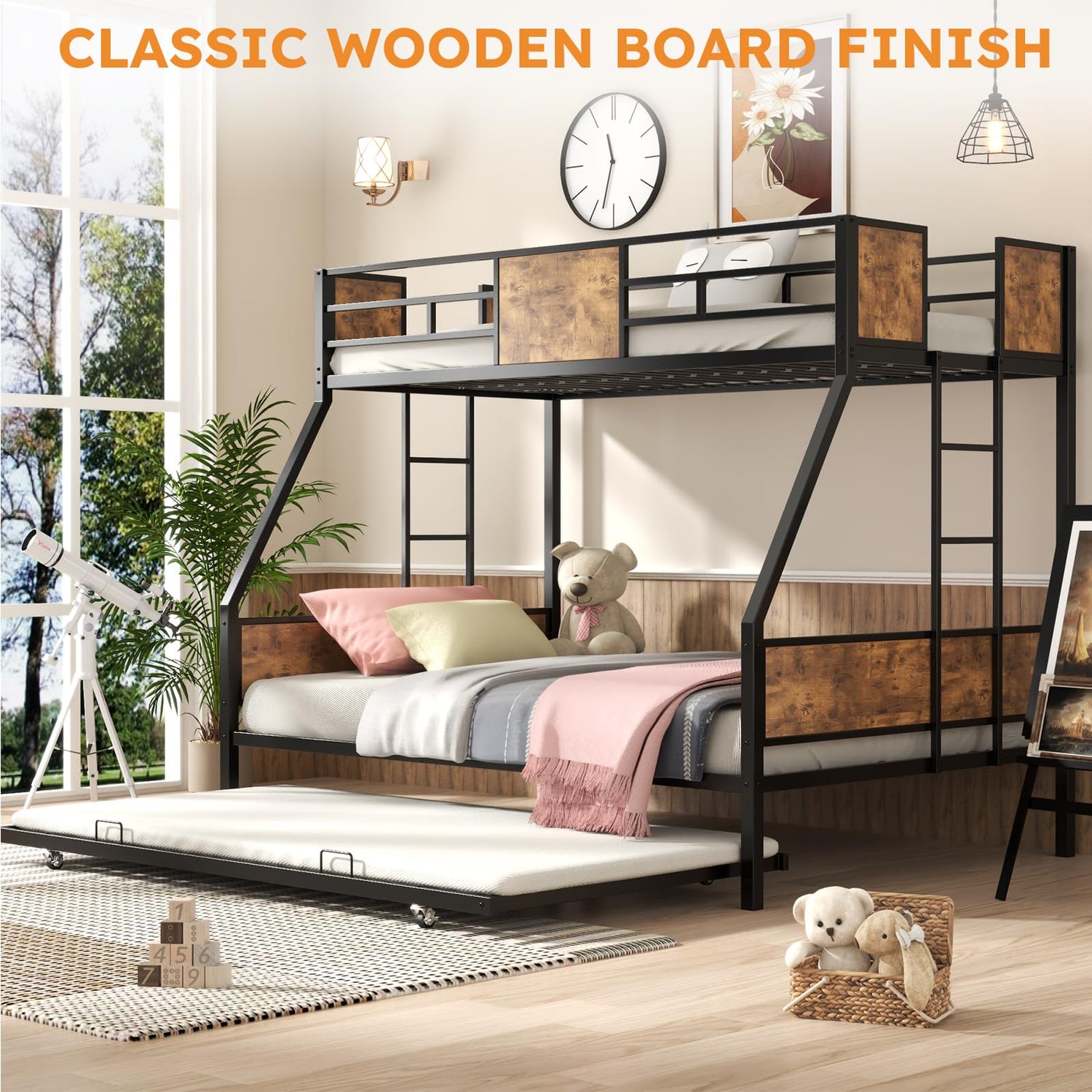 Zevemomo Twin Over Full Bunk Bed with Trundle, Metal Triple Bunk Bed with Full Length Protect 2 Side Ladders Bed Frame for Boys Girls Adults, No Box Spring Needed, Black