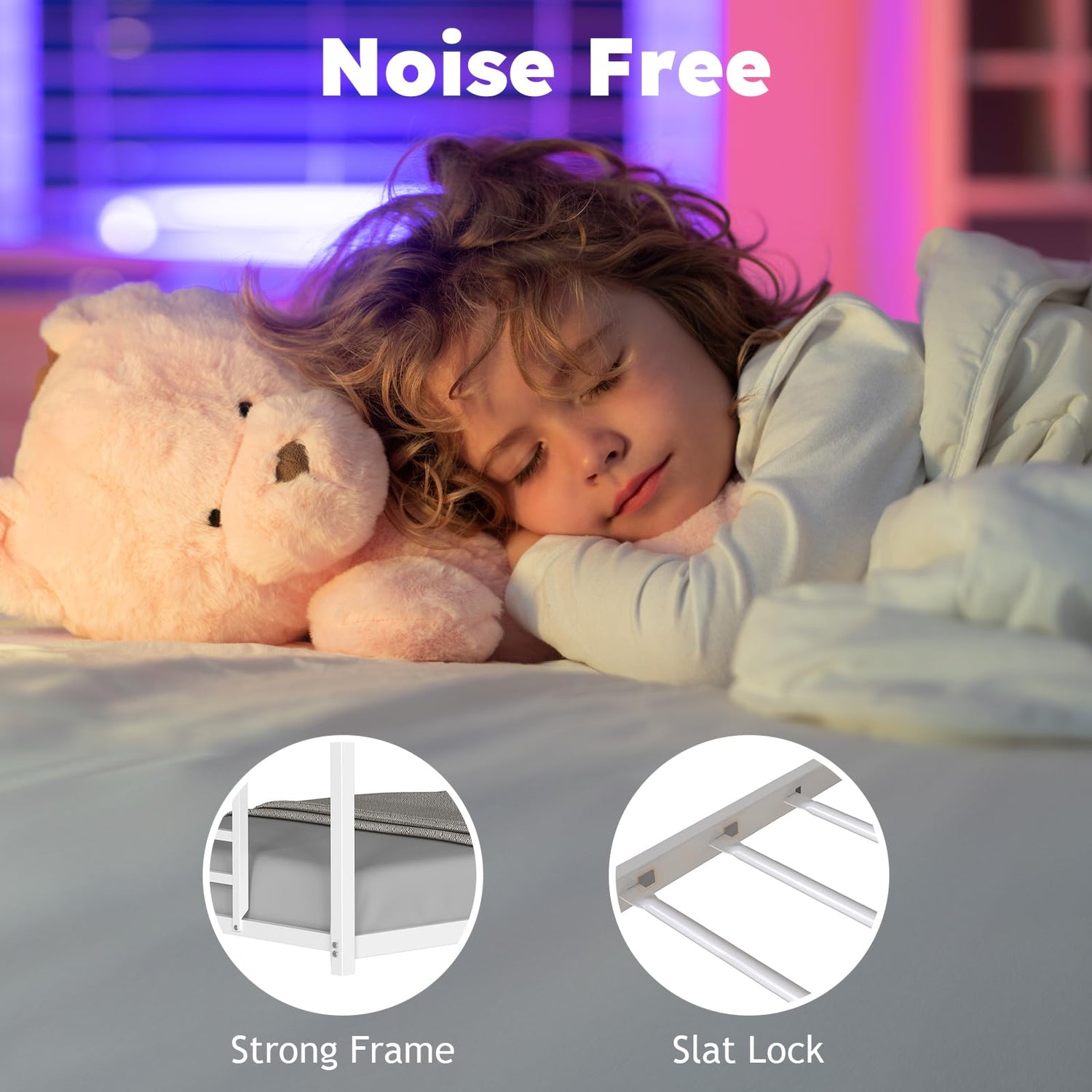 Zevemomo Twin Over Twin Bunk Bed, Metal Low Profile Bunkbeds with Full-Length Guardrail and Ladder, Space Saving, No Boxing Spring Needed, White