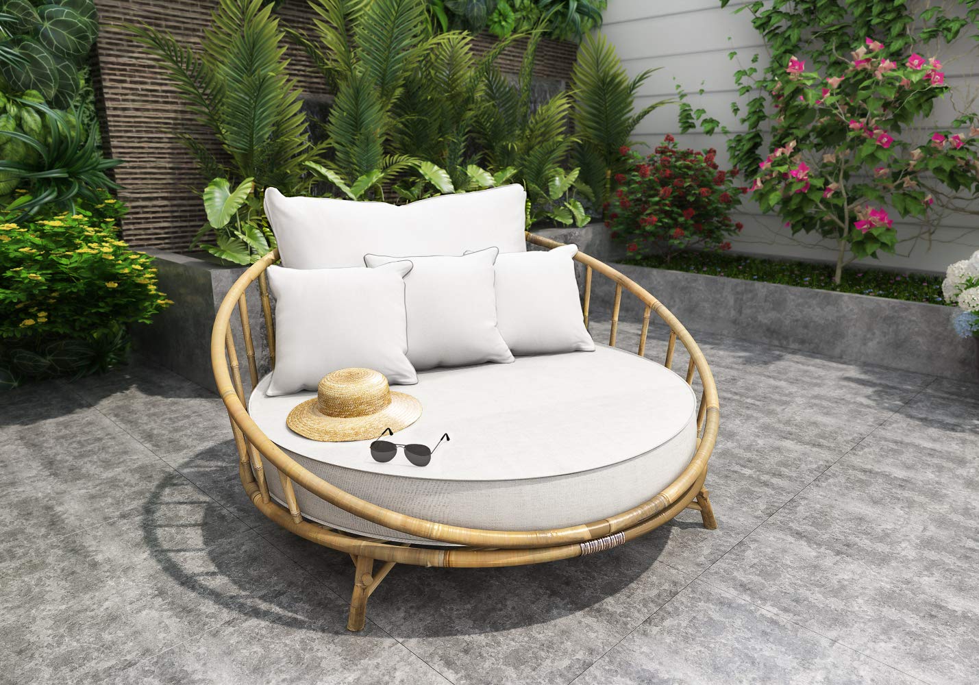 ZEW Rattan Bamboo Round Daybed Outdoor Sofa Chair with Cushion and Pillows for Backyard, Porch, Swimming Pool, Living Room