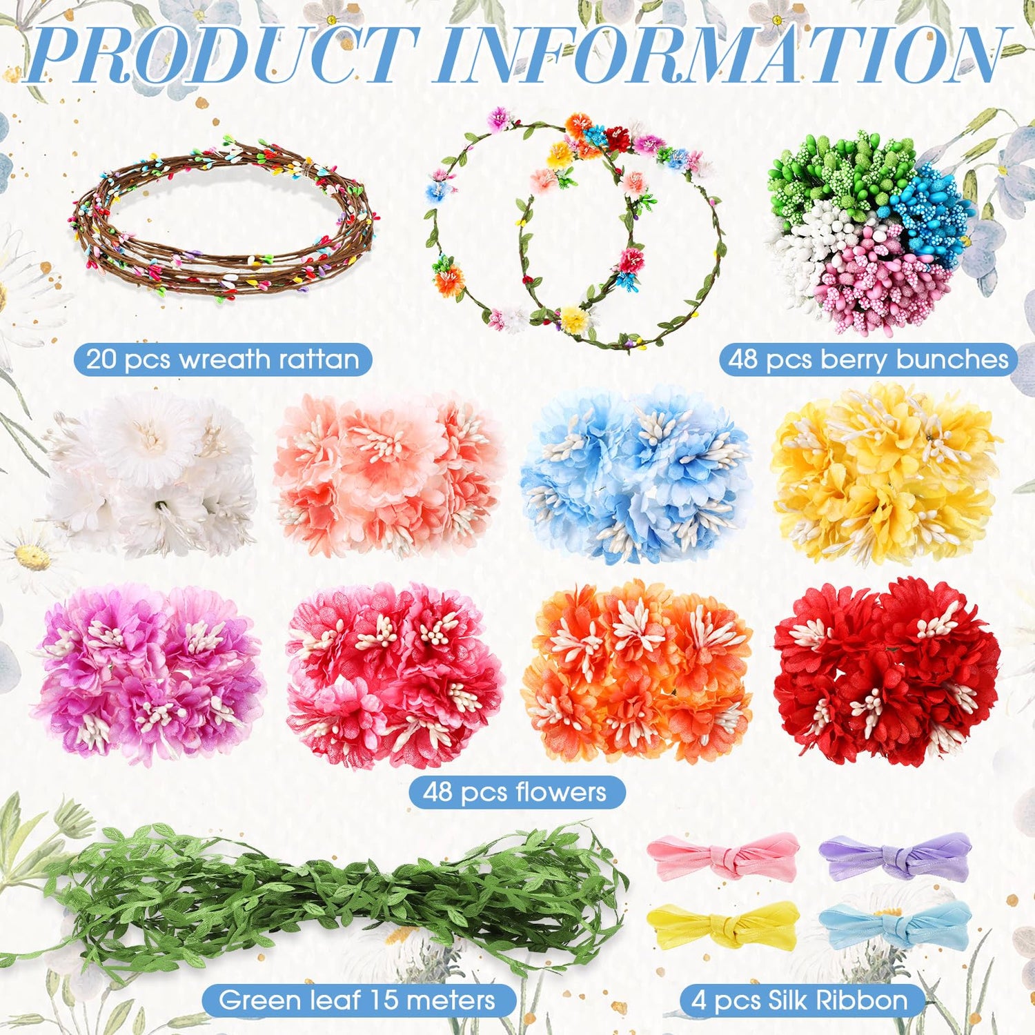- What You Will Get: the flower crown making kit includes 121 parts, such as 15 meters of leaf vines, 20 berry vines, 4 ribbons, 48 carnation flowers and 48 berry branches, which are perfectly combined to meet your various needs and bring you fun