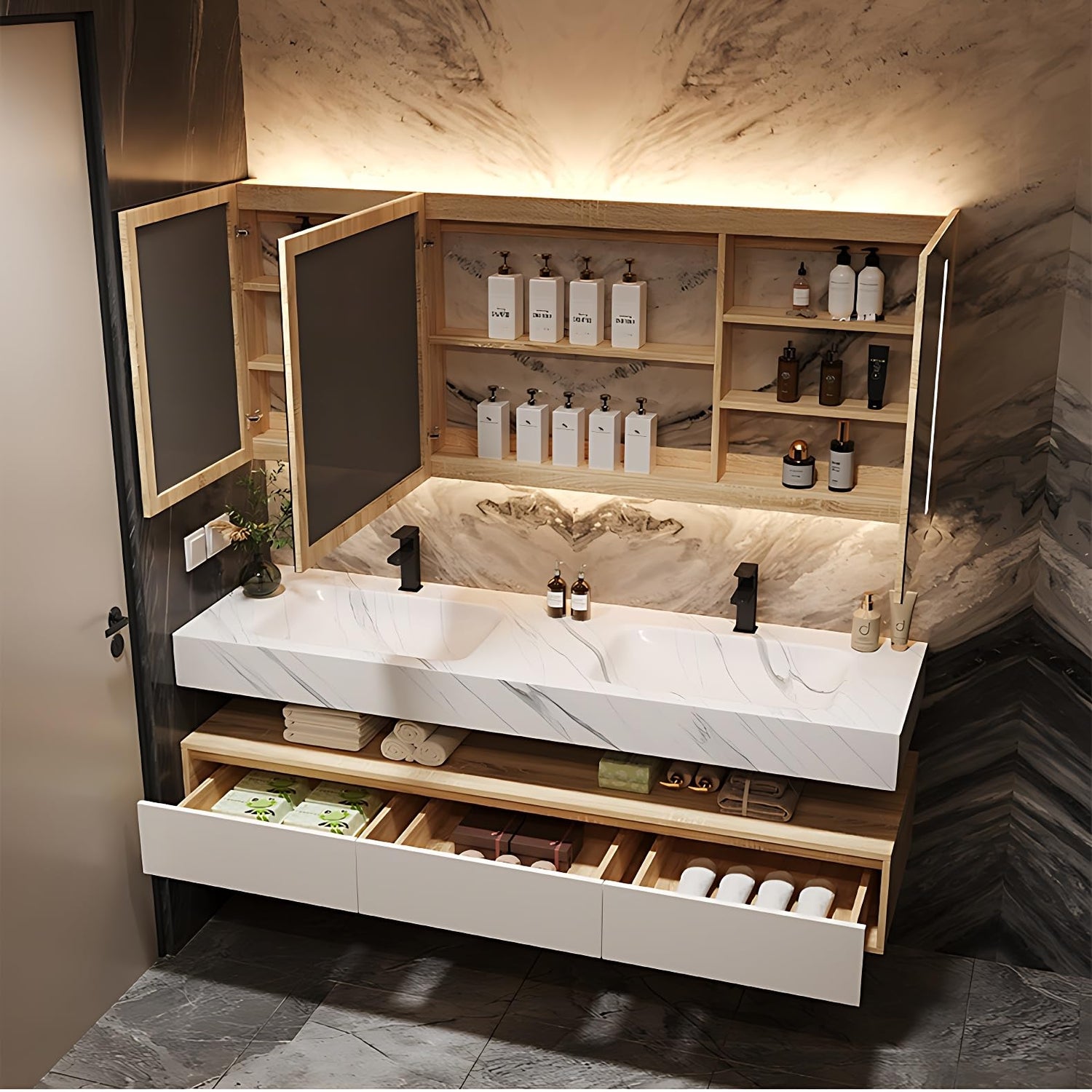 - Smart LED Defogging Medicine Cabinet: The upper part of the bathroom vanity is equipped with a smart LED defogging medicine cabinet, which integrates multi-functional storage partitions and smart defogging functions. Advanced electric heating technology can quickly remove the water mist after bathing, ensuring that the mirror surface is always clear, providing convenience and comfort for your use experience.