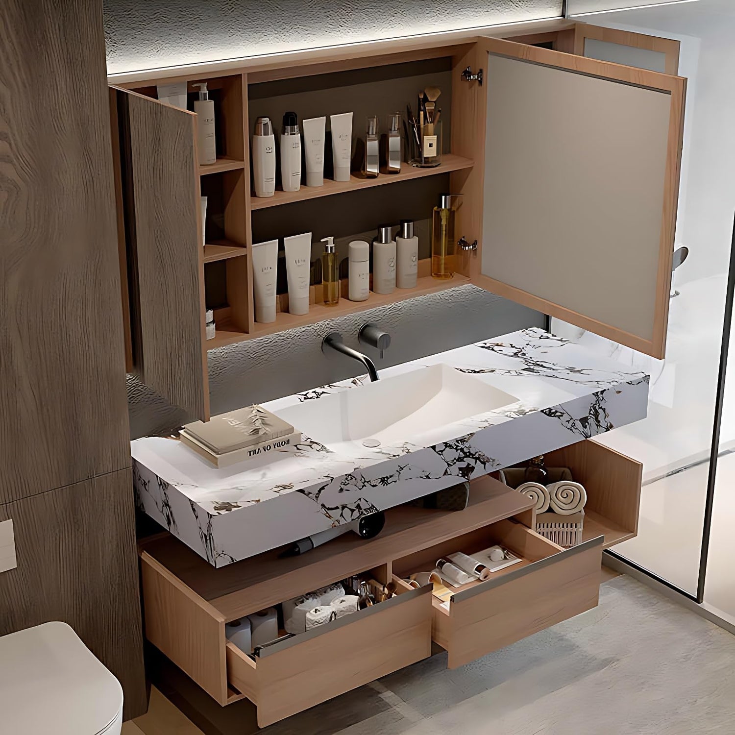 - Stylish and Natural Design: This bathroom vanity is based on natural wood color and offers two unique sink texture designs, which perfectly blends natural elements with modern technology. Equipped with LED lighting and smart defog mirror cabinet, it not only adds a modern feel to the bathroom, but also brings a unique use experience. No matter which style, it can be easily controlled to enhance the overall taste of the space.