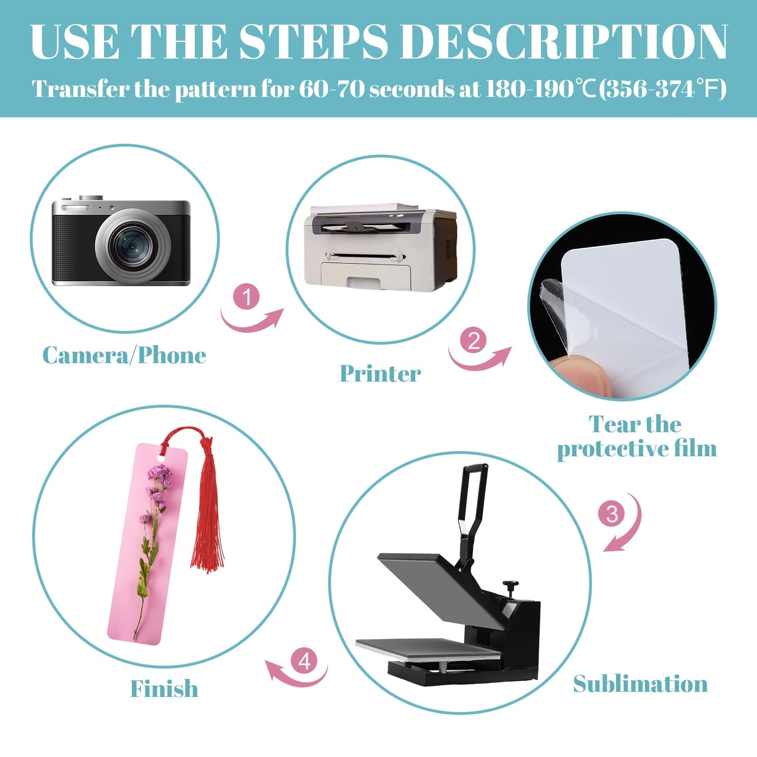 - Personalize with Ease: Customize these sublimation bookmarks with your designs, logos, or messages using sublimation printing. Transfer at 340°F for 50 seconds; adjust time and temperature for darker colors
