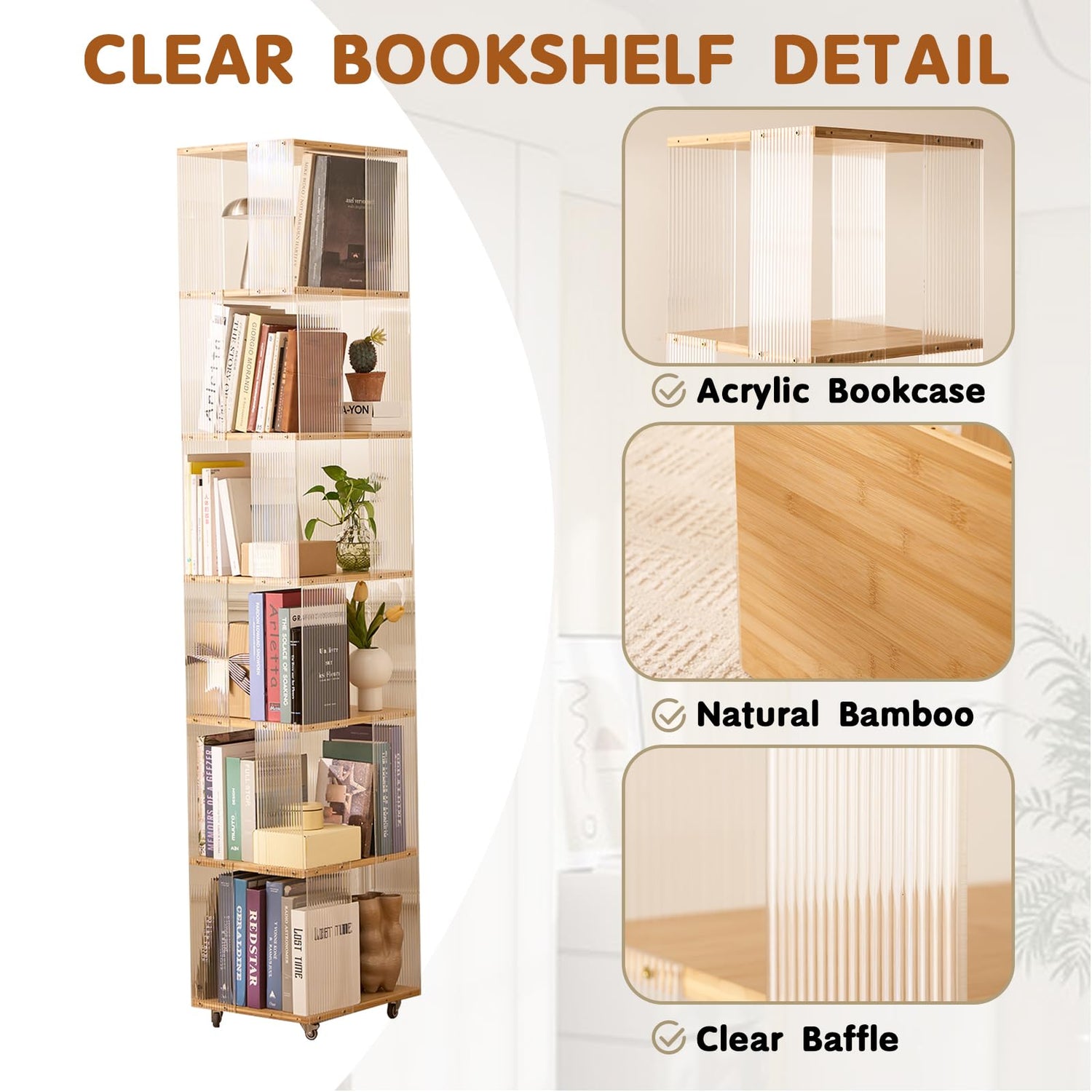 ZHUMUJIAJU 6-Tier Rotating Bookshelf- 360° Spinning Bookshelf Tower Kids, Tall Narrow Bookshelves with Wheels, Acrylic Clear Bookcase, Modern Storage Organizer for Home Office, Living Room, Bedroom