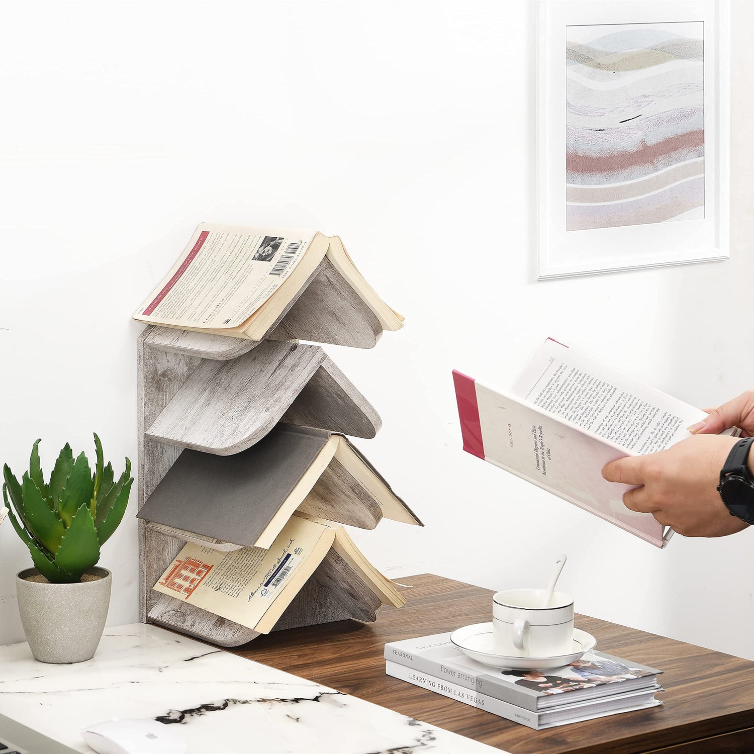 - Unique Design : Tree bookshelf appearance is small and beautiful. Not only can storage shelf be well integrated into the home and office style, but also be placed on the tabletop, bedside, nightstand. At the same time, the book can be directly stored up after reading.
